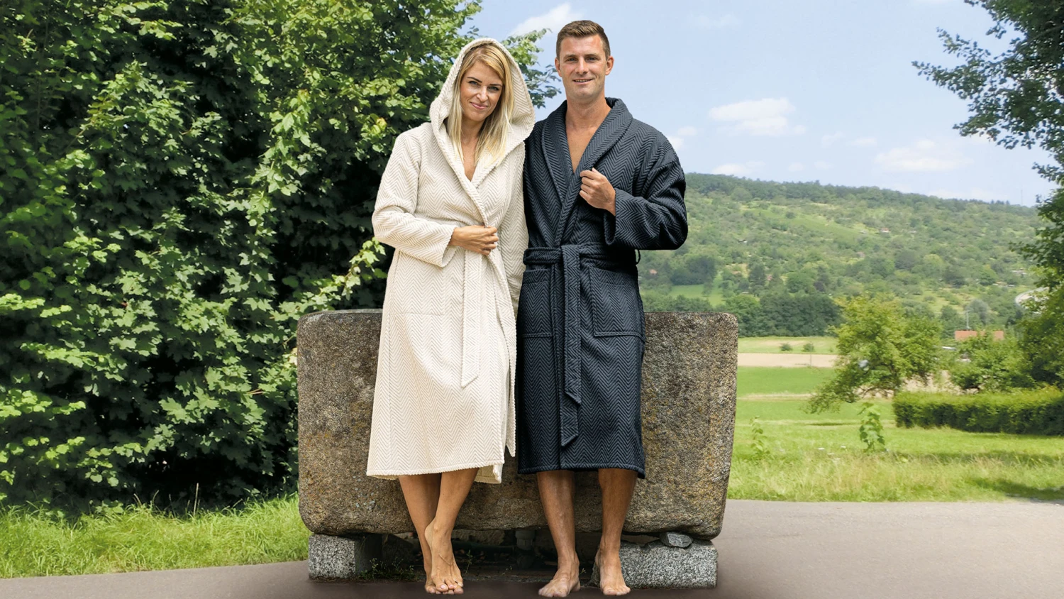 Variante 01 – Bademantel in charmantem Crème mit gemĂĽtlicher Kapuze und tailliertem Schnitt, Länge 110 cm