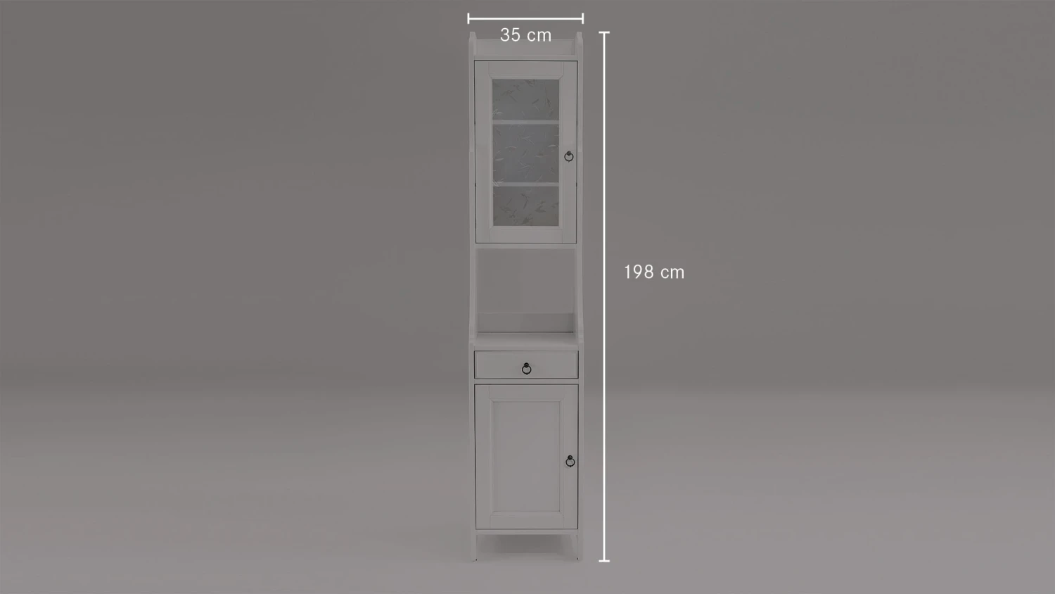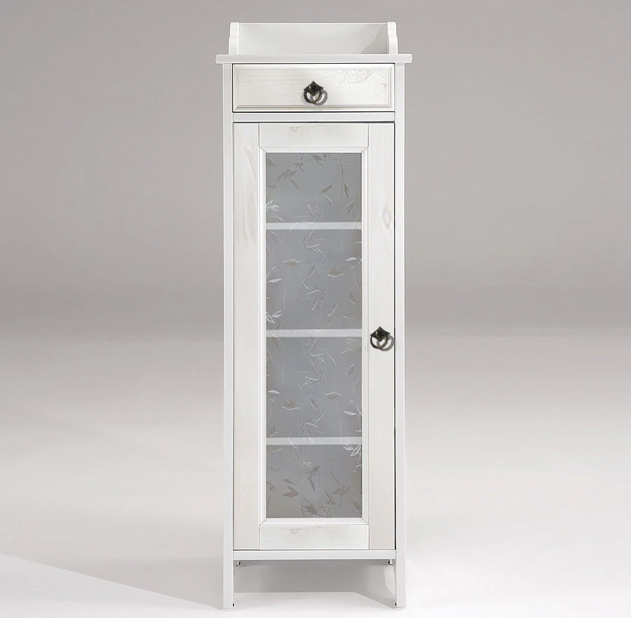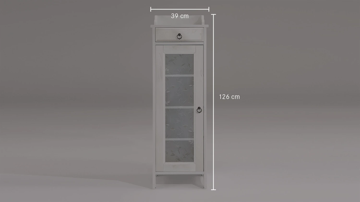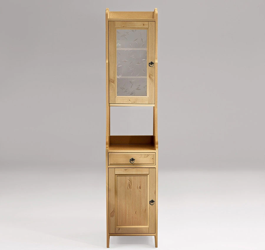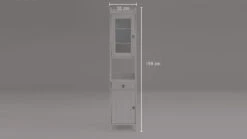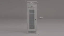 mit 1 Schublade und 2 TĂĽren – davon die obere mit Glasfront und 2 Fachböden und die untere mit Holzfront und 1 Fachboden