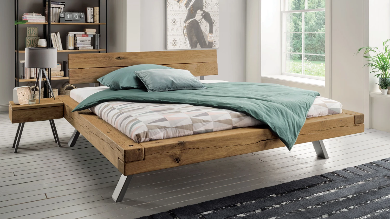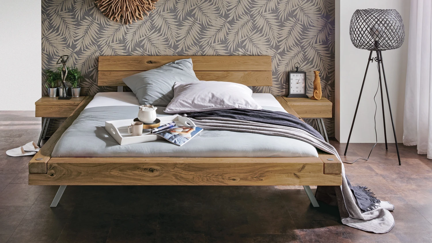 - edel rustikales Balkenbett im modernen Industriestil