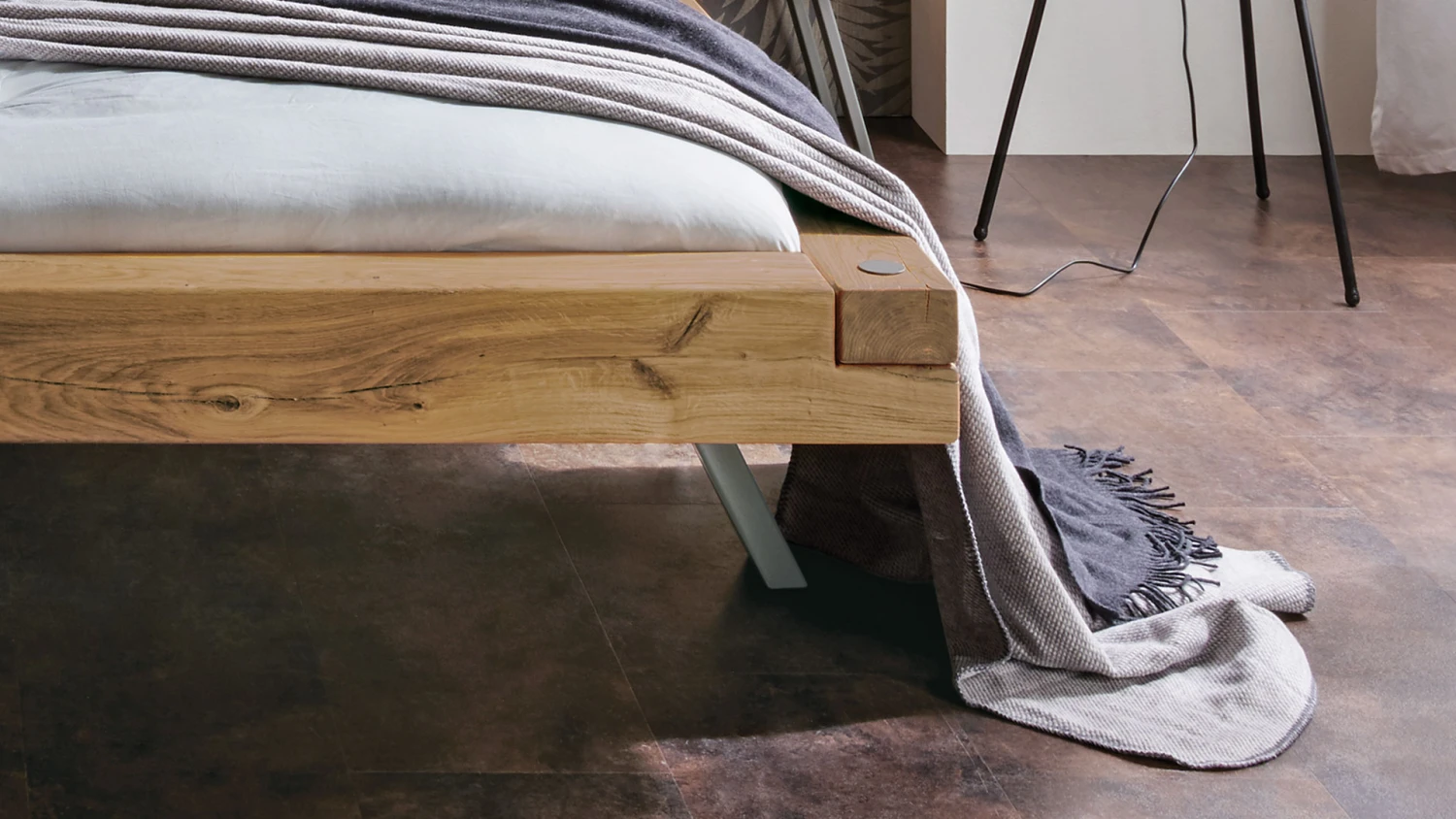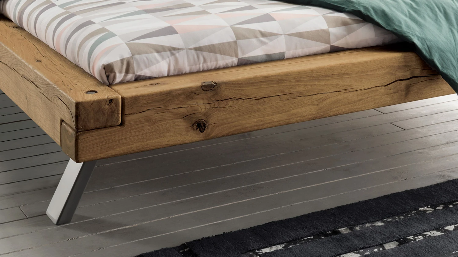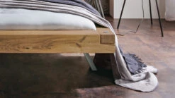 - faszinierende Fußlösung aus Metall – die Bettkufe ist so angebracht, dass der Querbalken nach oben zeigt und die Schenkel zu ausgestellten Füßen werden