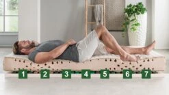 - 7-Zonen-KörperstĂĽtzsystem mit Querkanälen im Schulterbereich – die Schulter sinkt optimal ein, Schulter und HĂĽfte werden bequem abgefedert und die Wirbelsäule wird in jeder Lage orthopädisch richtig gelagert