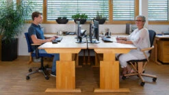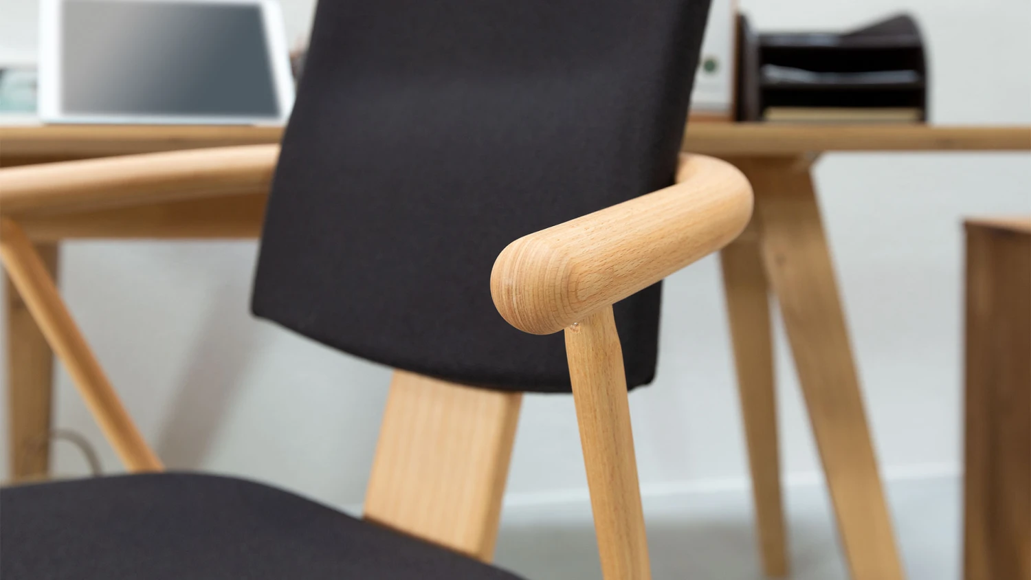 - optional auch mit bequem geschwungenen Armlehnen aus Buchen-Formholz lieferbar – bewusst zurĂĽckgesetzt und geneigt, um eine statische Sitzhaltung mit dauerhaft abgestĂĽtzten Armen zu verhindern
