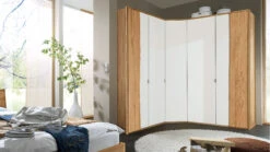 - Kleiderschrank mit matter Weißglas-Front und außergewöhnlichem Türenpaar mit Baumkante aus Massivholz