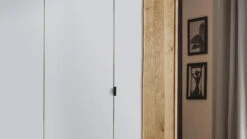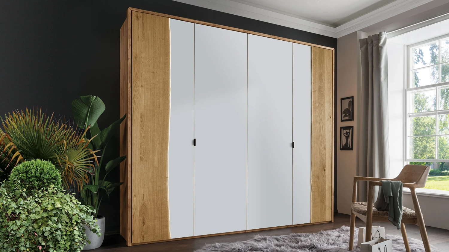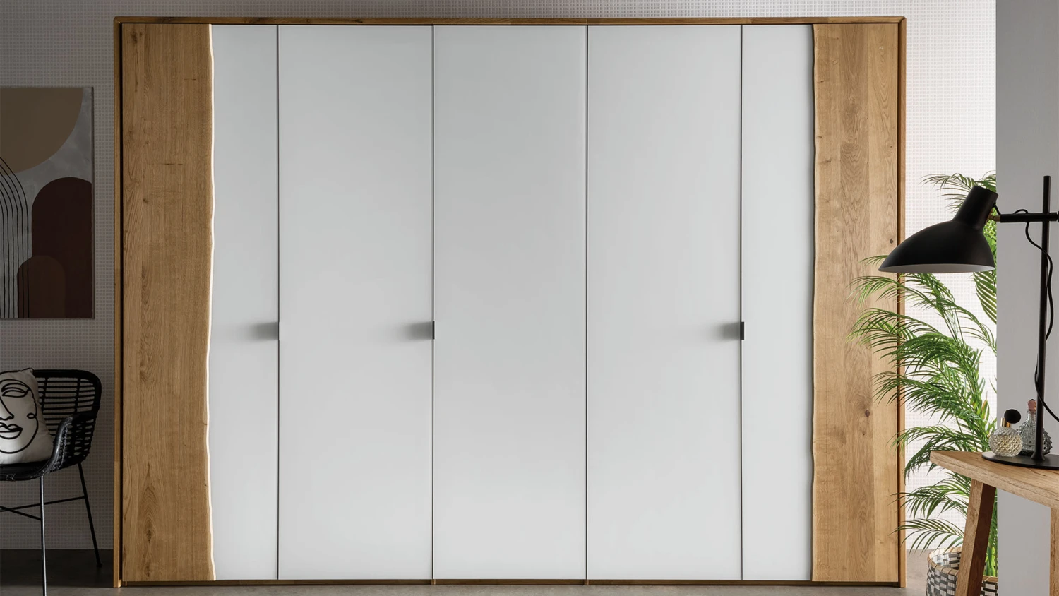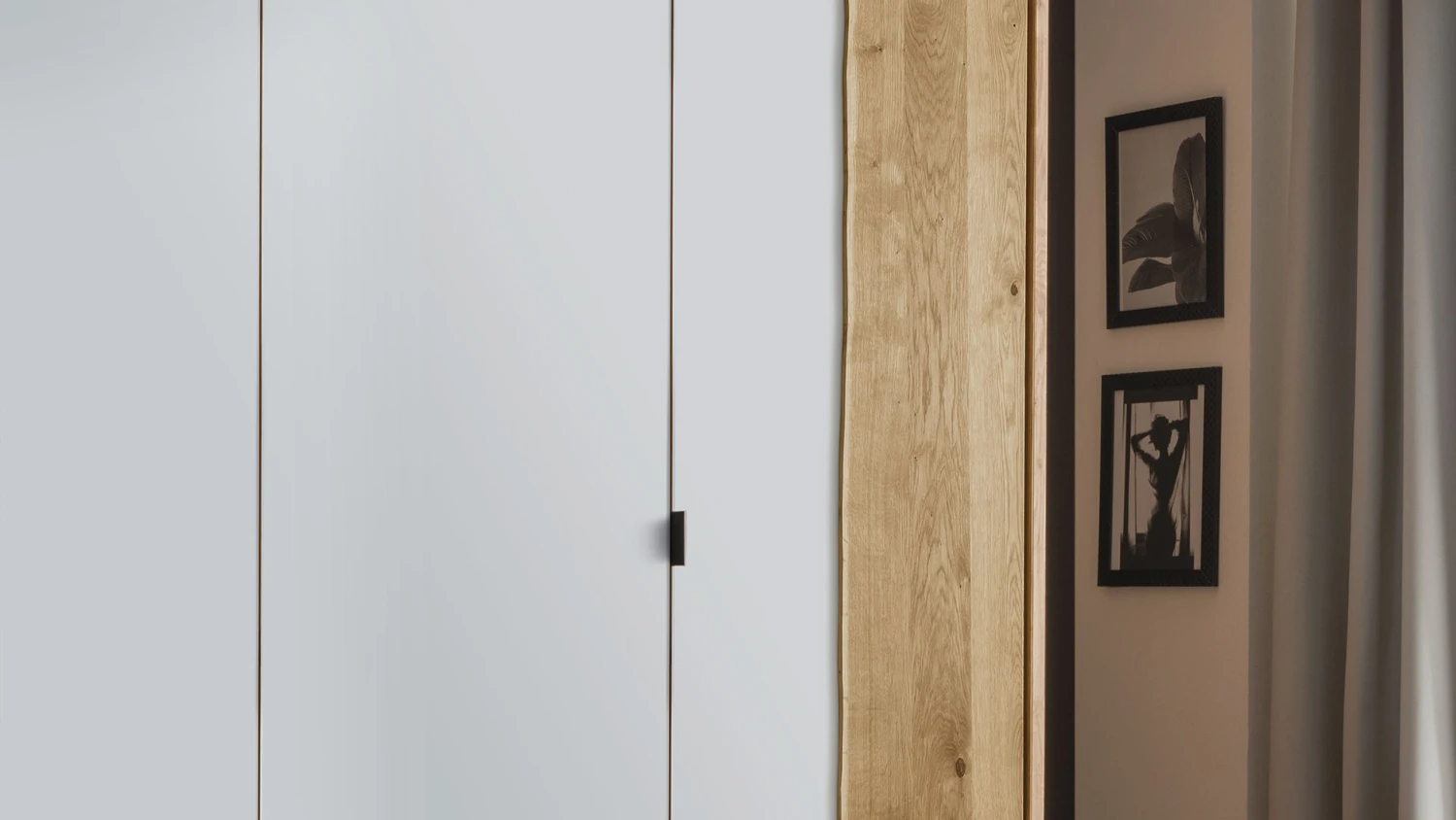 - Kleiderschrank mit matter Weißglas-Front – die zwei äußeren Türen immer jeweils mit einer außergewöhnlichen Baumkante aus Massivholz