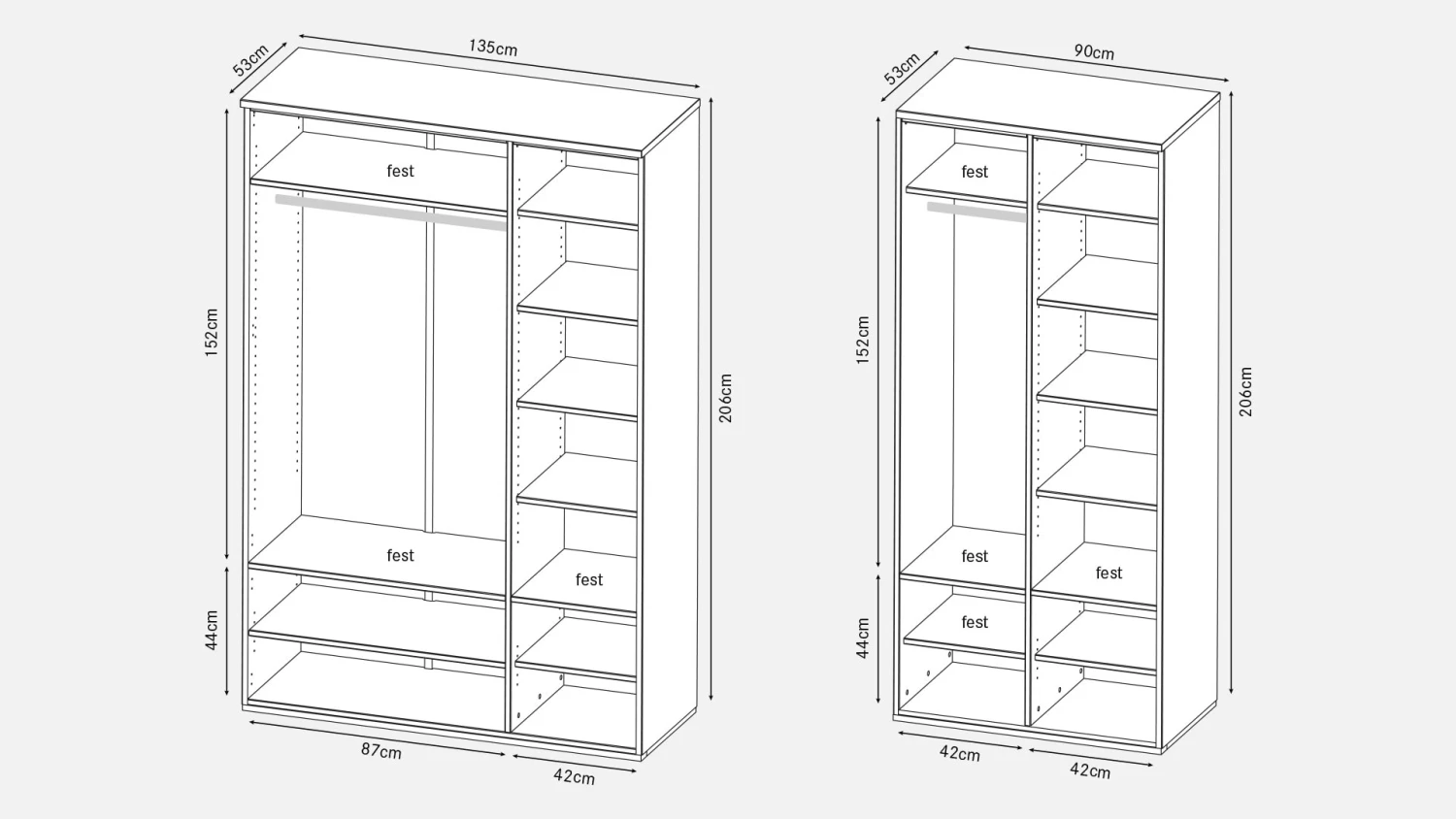 - Schrank-Inneneinteilung: beim 2-Türer 2 schmale Schrankelemente, beim 3-Türer 1 breites und 1 schmales Schrankelement
