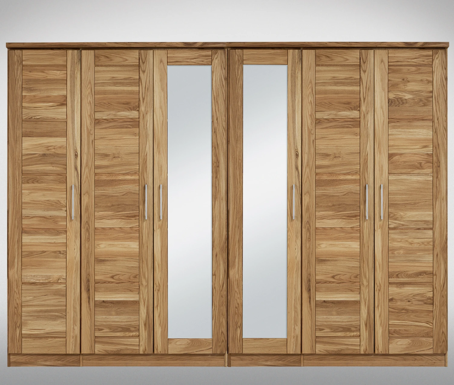 2 breite Schrankelemente mit jeweils 1 langen Einlegeboden und 1 langen Kleiderstange, links und in der Mitte 1 schmales Schrankelement mit 1 kurzen Einlegeboden und 1 kurzen Kleiderstange, 2 Spiegelfronten in der Mitte