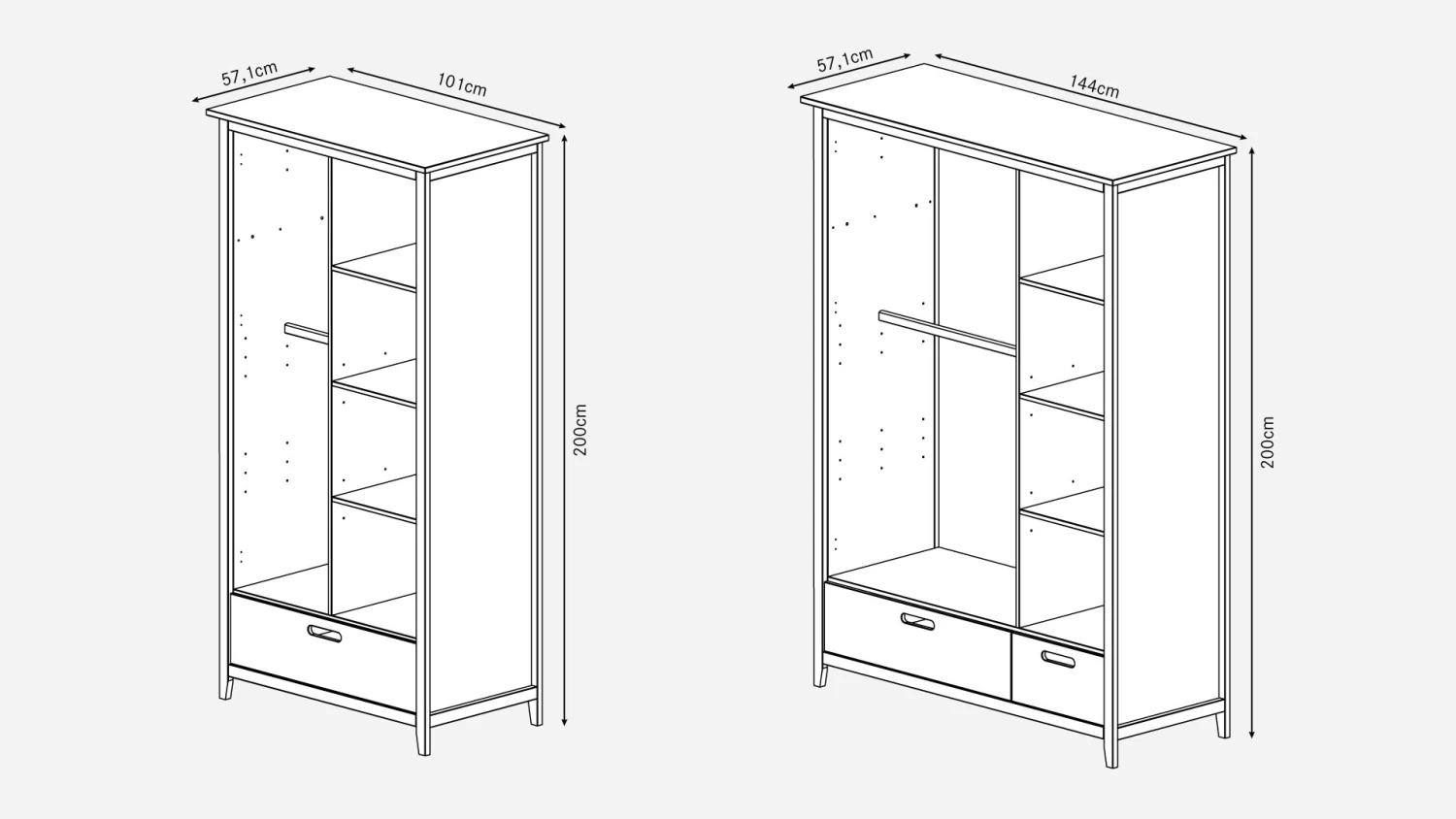 links 1 lange Kleiderstange, darunter 1 breite Schublade, rechts 3 kurze Einlegeböden, darunter 1 schmale Schublade