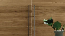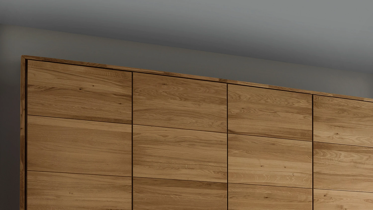 - wahlweise aus massivem Kernbuchen- oder Wildeichenholz, Fronten aufwändig stabverleimt mit durchgehenden Lamellen, Korpus parkettverleimt