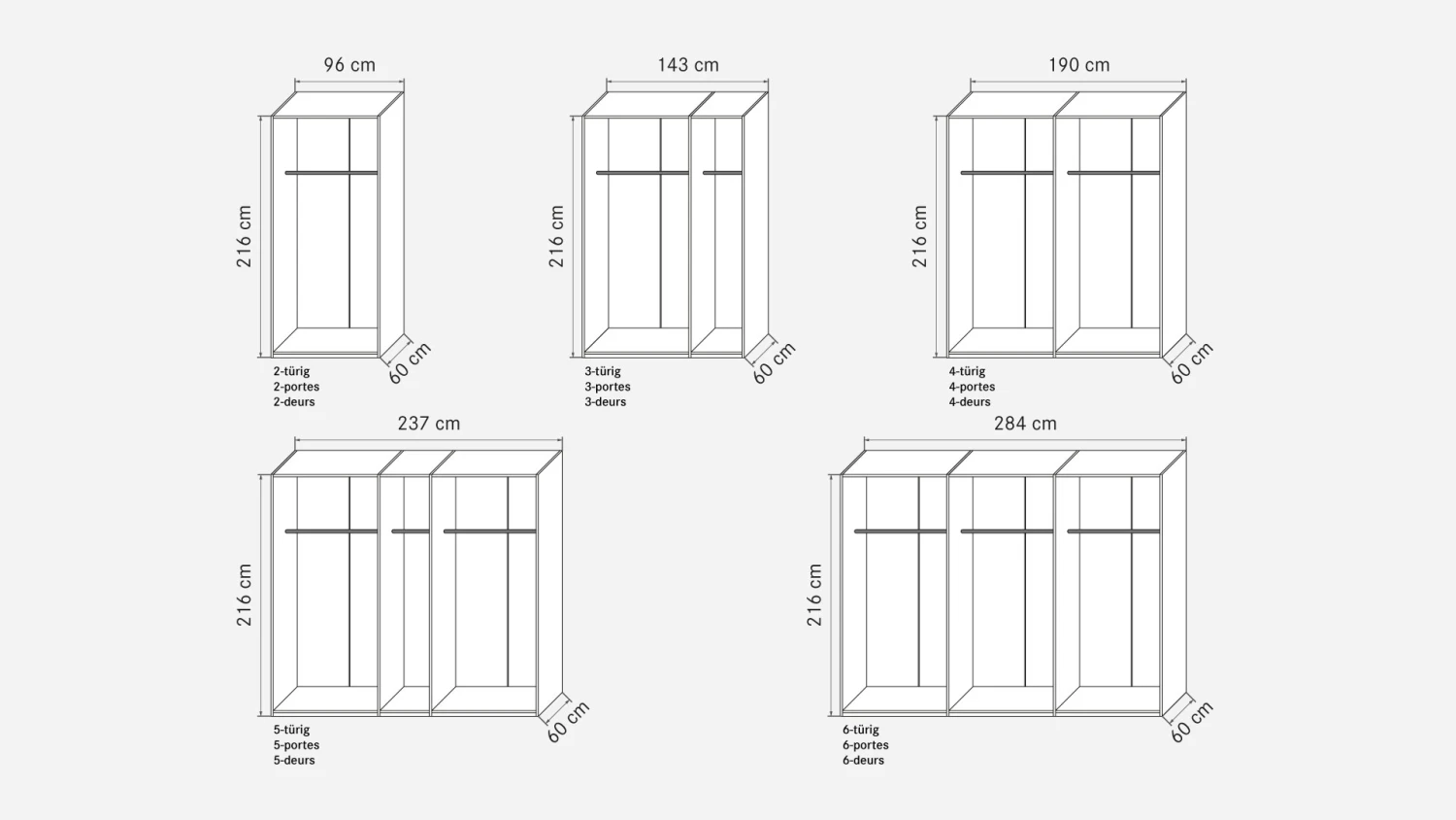 - Kleiderschrank in 10 Breiten erhältlich, 2- bis 6-Türer jeweils in 2 Breiten (50er und 60er-Raster)