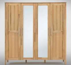 links 1 breites Schrankelement mit 1 langen Einlegeboden und 1 langen Kleiderstange, rechts 1 schmales Schrankelement mit 1 kurzen Einlegeboden und 1 kurzen Kleiderstange - 4-türiger Schrank mit Spiegel