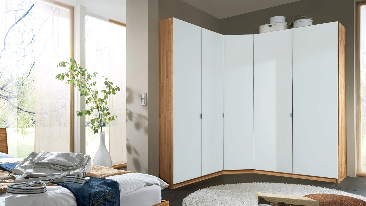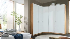 Eckmodul mit 3 kurzen Einlegeböden,1 Trennwand und 1 langen Kleiderstange, darüber 1 großer Einlegeboden – nur in Kombination mit einem Grundmodul aufstellbar – hierzu passt eine Einzeltür im 50er-Raster - Türen mit Weißglas