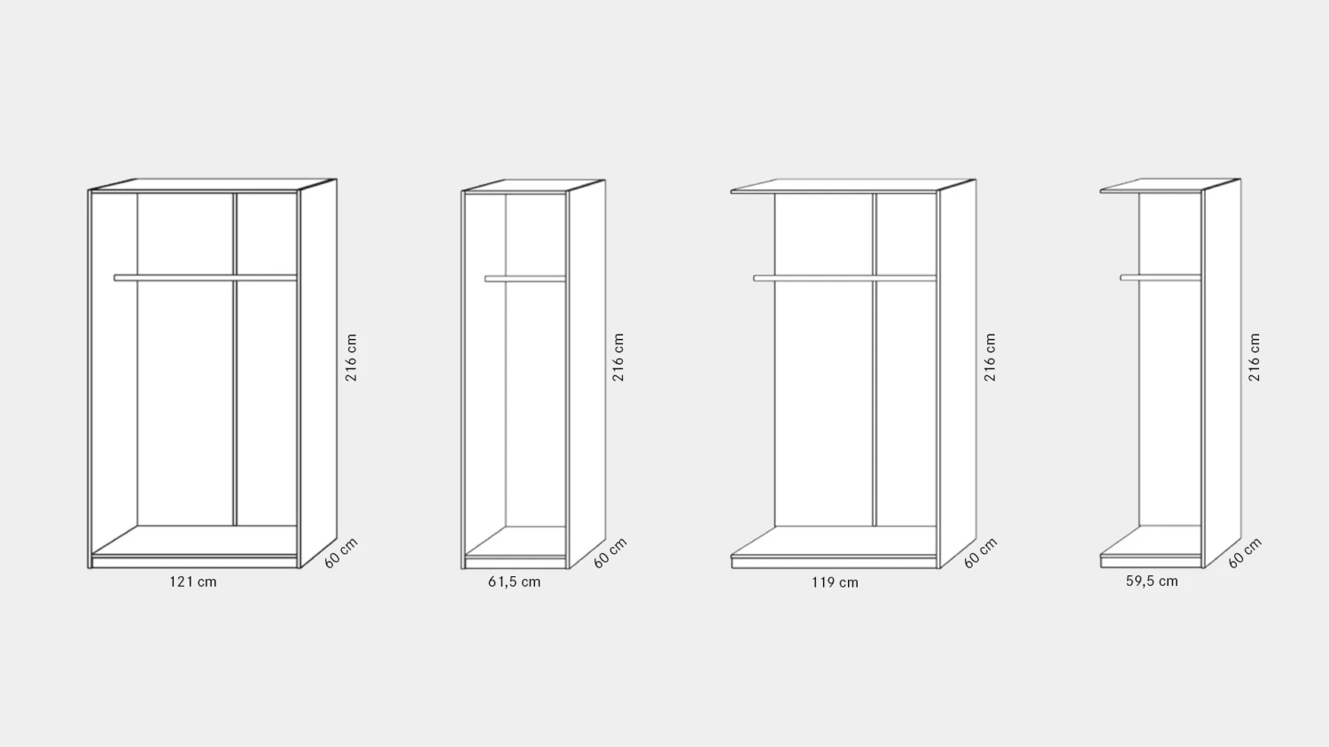 - Module in jeweils 4 Breiten und 2 Rastermaßen erhältlich – in den Maßgrafiken erhalten Sie auch Informationen zur Inneneinteilung