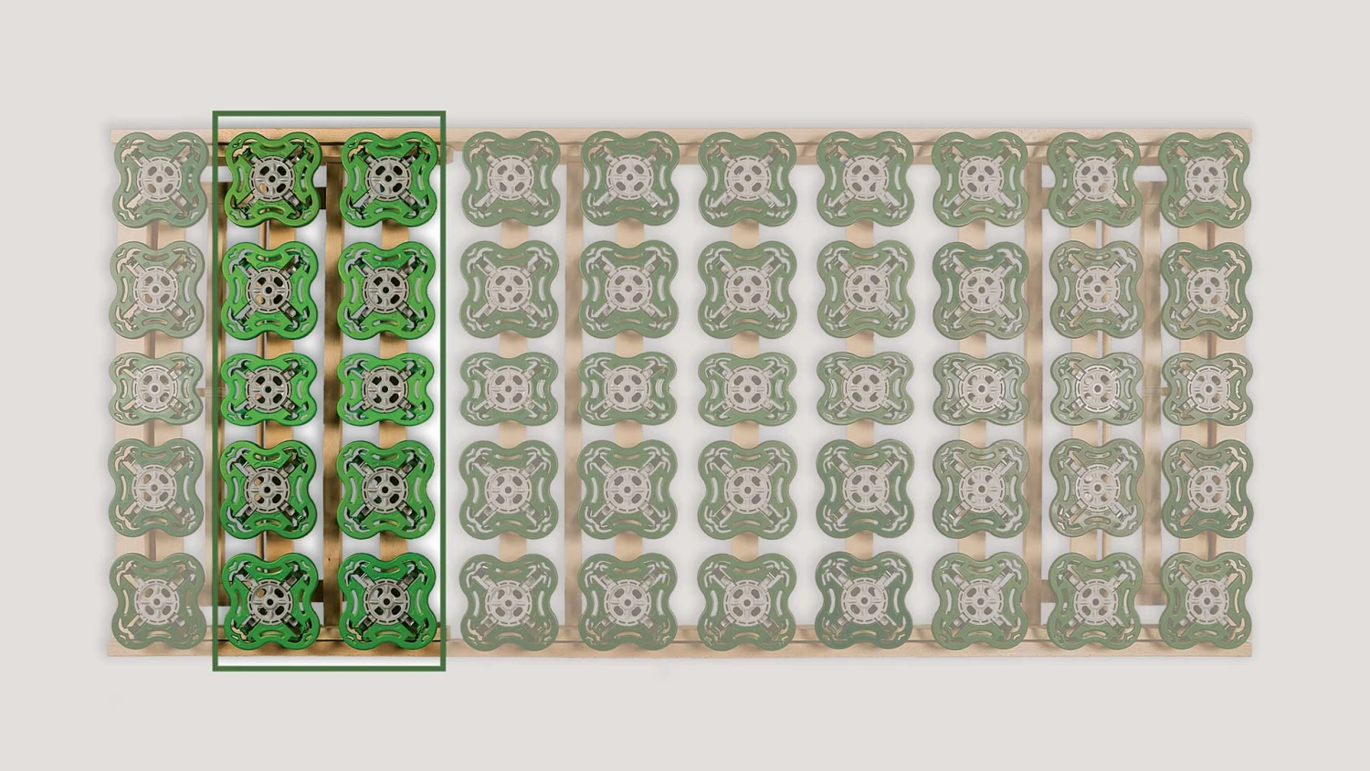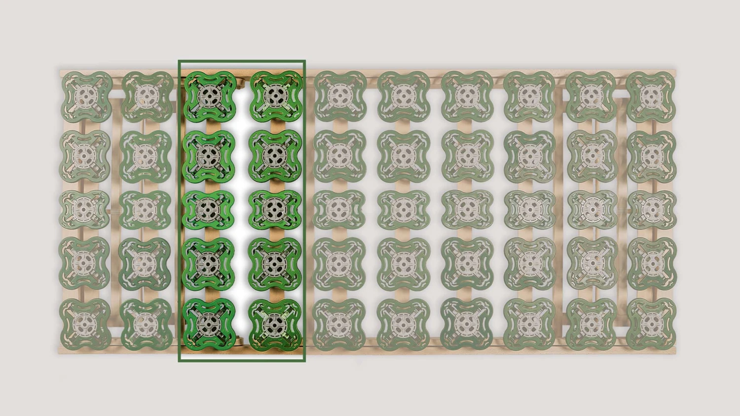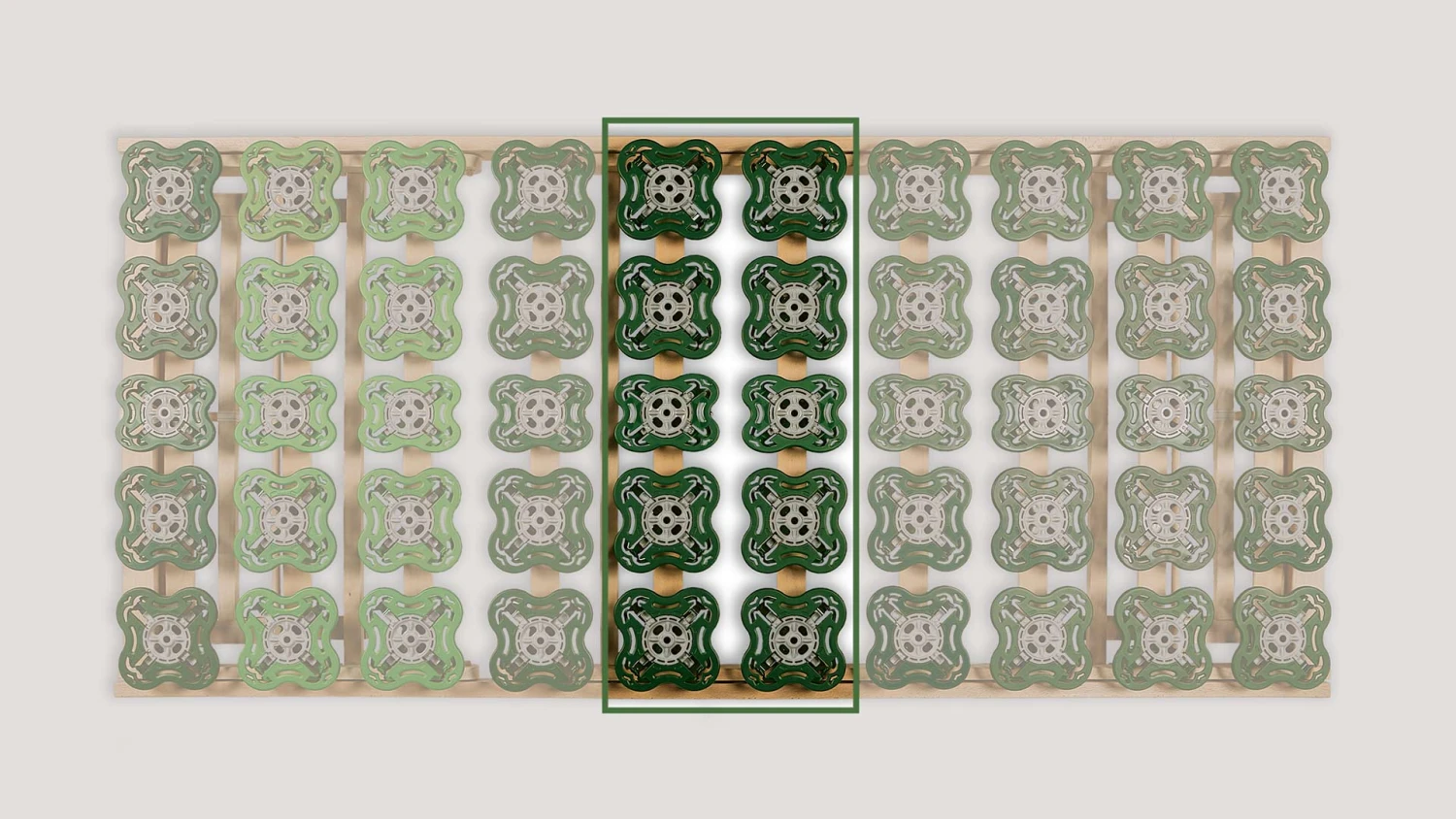 - doppeltes Federsystem – perfekte, perfekte, „dreidimensionale“ Anpassung an die Körperkonturen durch auf überwölbten Federleisten angebrachten Federtellern