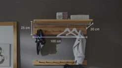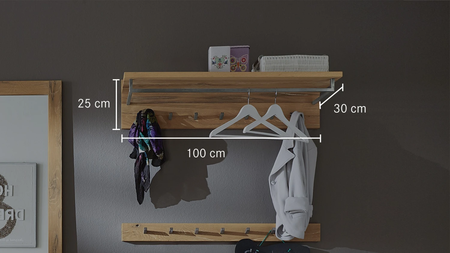 Wandgarderobe mit U-förmiger Kleiderstange, darin eingearbeitet 3 Kleiderhaken; Kleiderstange einseitig verblendet mit schönem Massivholz-Paneel, daran auf halber Höhe 4 Kleiderhaken angebracht; mit praktischem Ablagerost am unteren Ende des Paneels