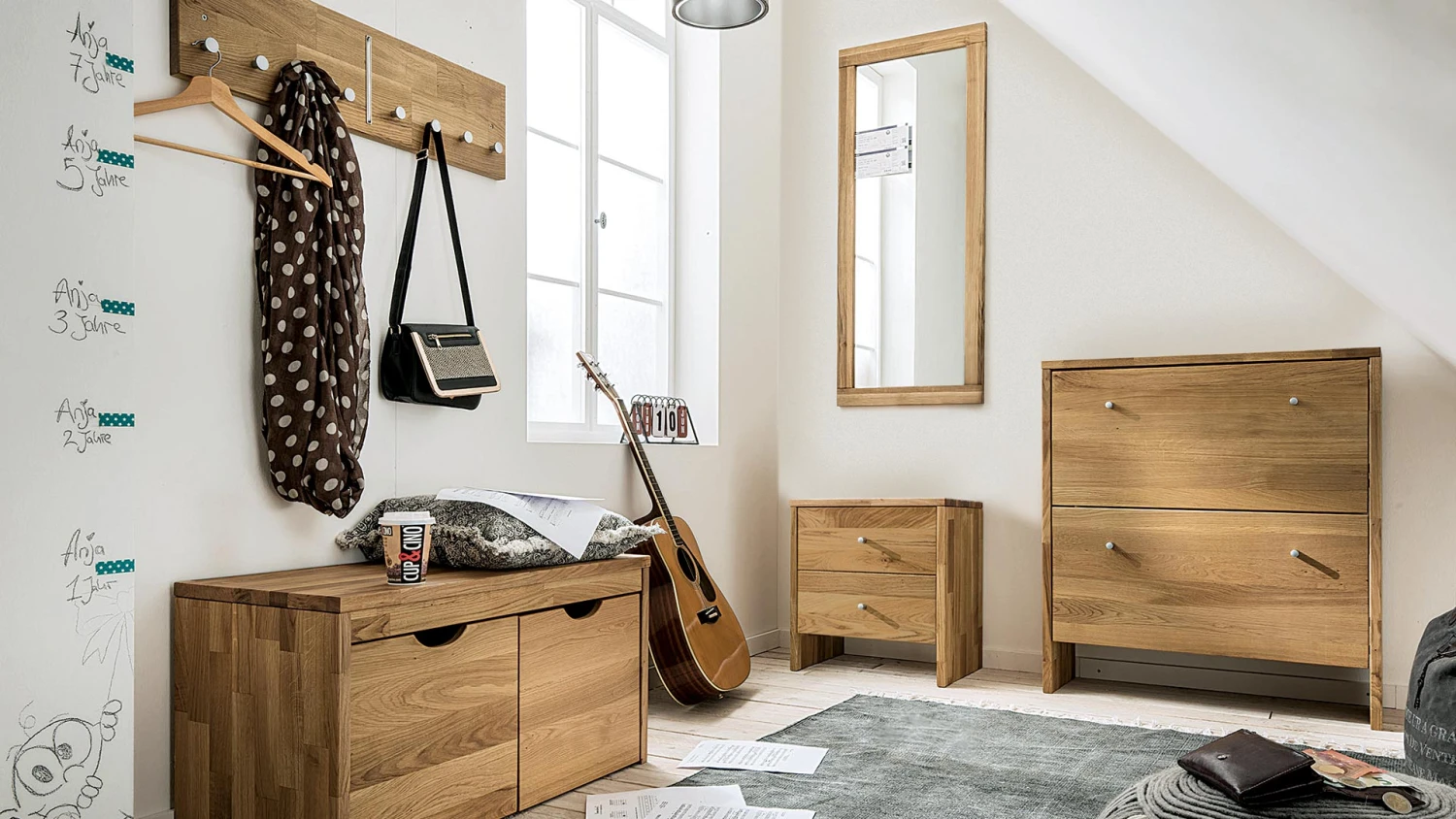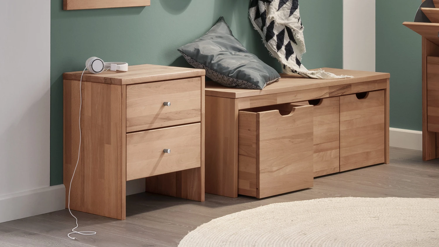 - aus massivem Kernbuchen- oder Wildeichenholz, Fronten aufwändig stabverleimt mit durchgehenden Lamellen, Korpus parkettverleimt