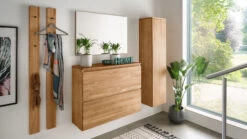 moderne Wandgarderobe mit 3 Kleiderhaken in trendiger Nagel-Optik - 1x Hänge-Schuhschrank schmal mit Holz-Körben
