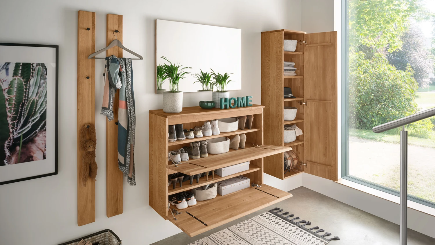 breiter Schuhschrank mit 2 Klappen, dahinter je 1 Schuhkorb – insgesamt hinter beiden Klappen Platz fĂĽr bis zu 14 Paar Schuhe - 1x groĂźer Spiegel
