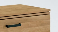 - aus massivem Wildeichenholz, Fronten aufwändig stabverleimt mit durchgehenden Lamellen, Korpus parkettverleimt