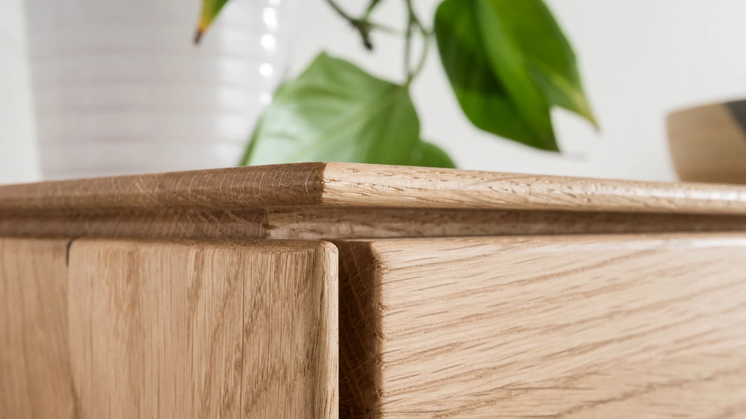- aus massivem Wildeichenholz, Front und Deckplatte aufwändig stabverleimt mit durchgehenden Lamellen, Korpus parkettverleimt