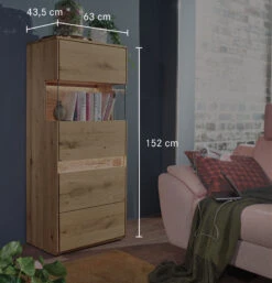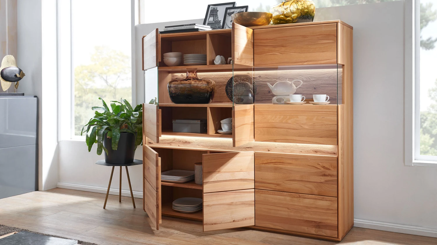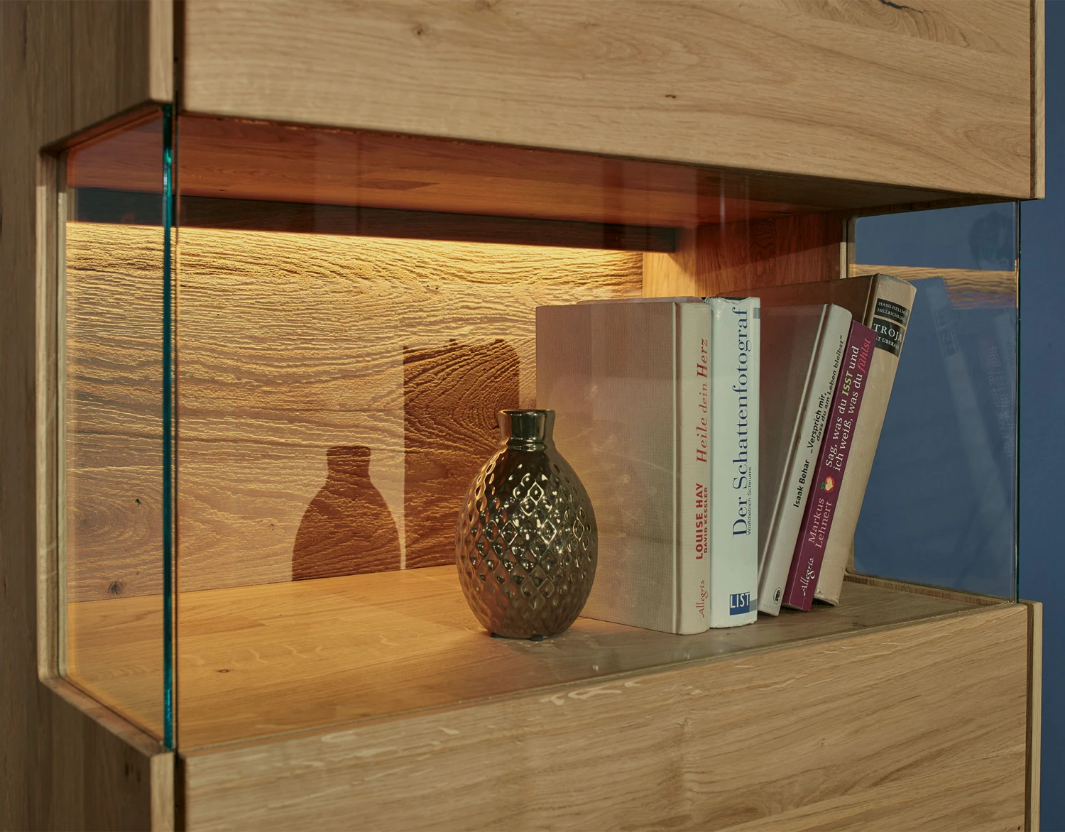 rechts 1 breite Holztür mit mittigem Glaseinsatz, dahinter 2 breite Einlegeböden, darunter 1 breite Holztür, dahinter 1 breiter Einlegeboden