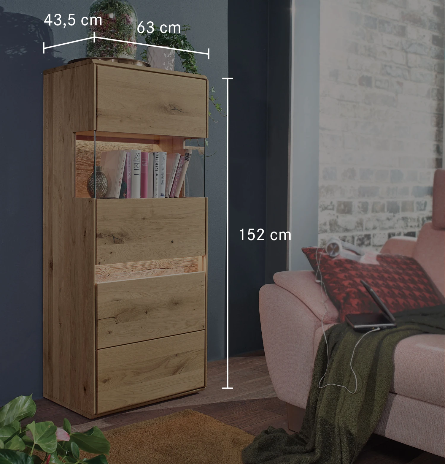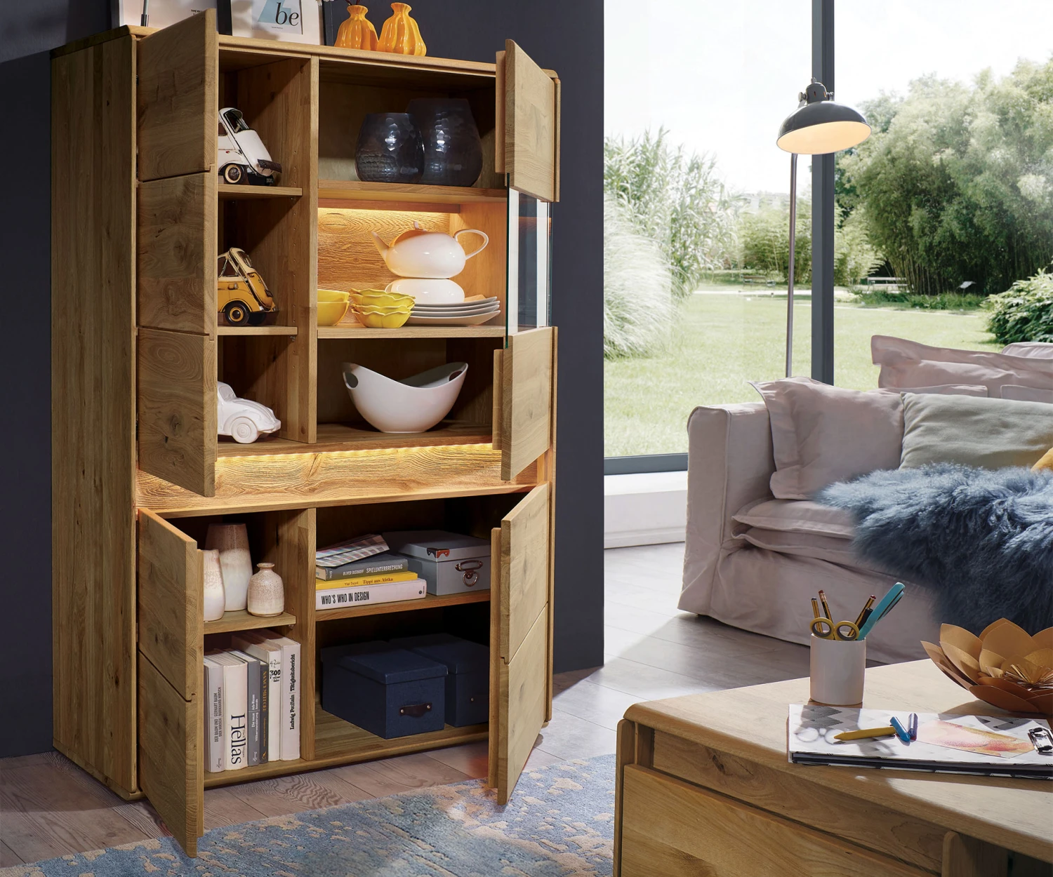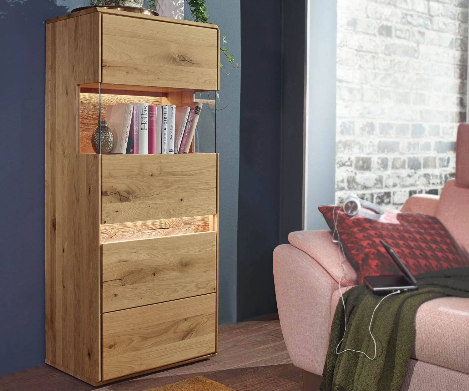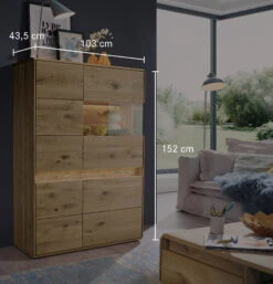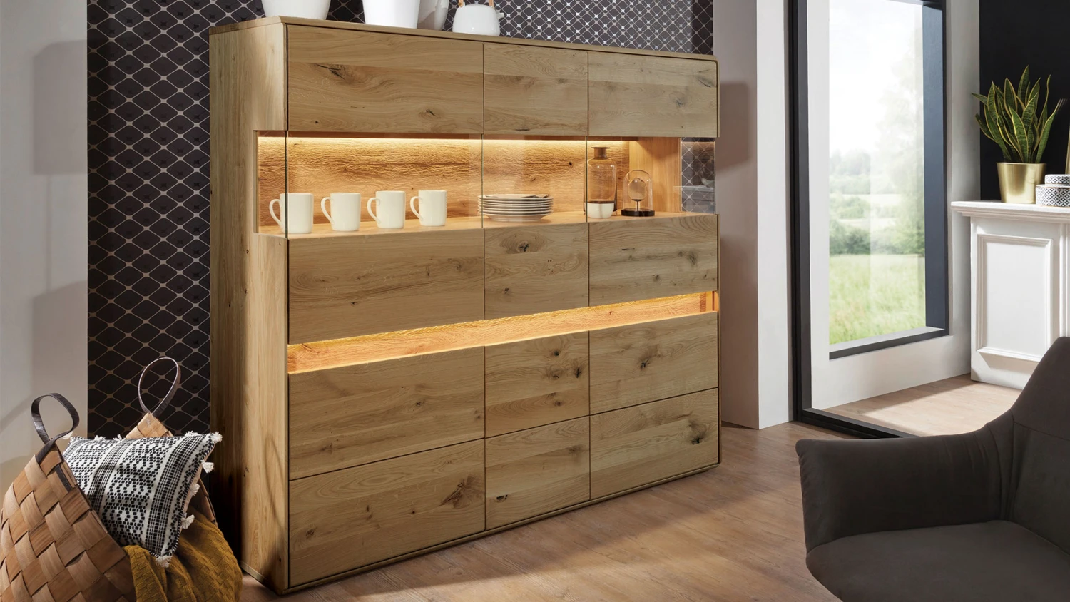 - das gebĂĽrstete Eichenholz an den Applikationen ist ein ganz besonderer Blickfang