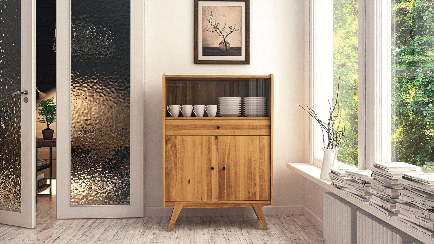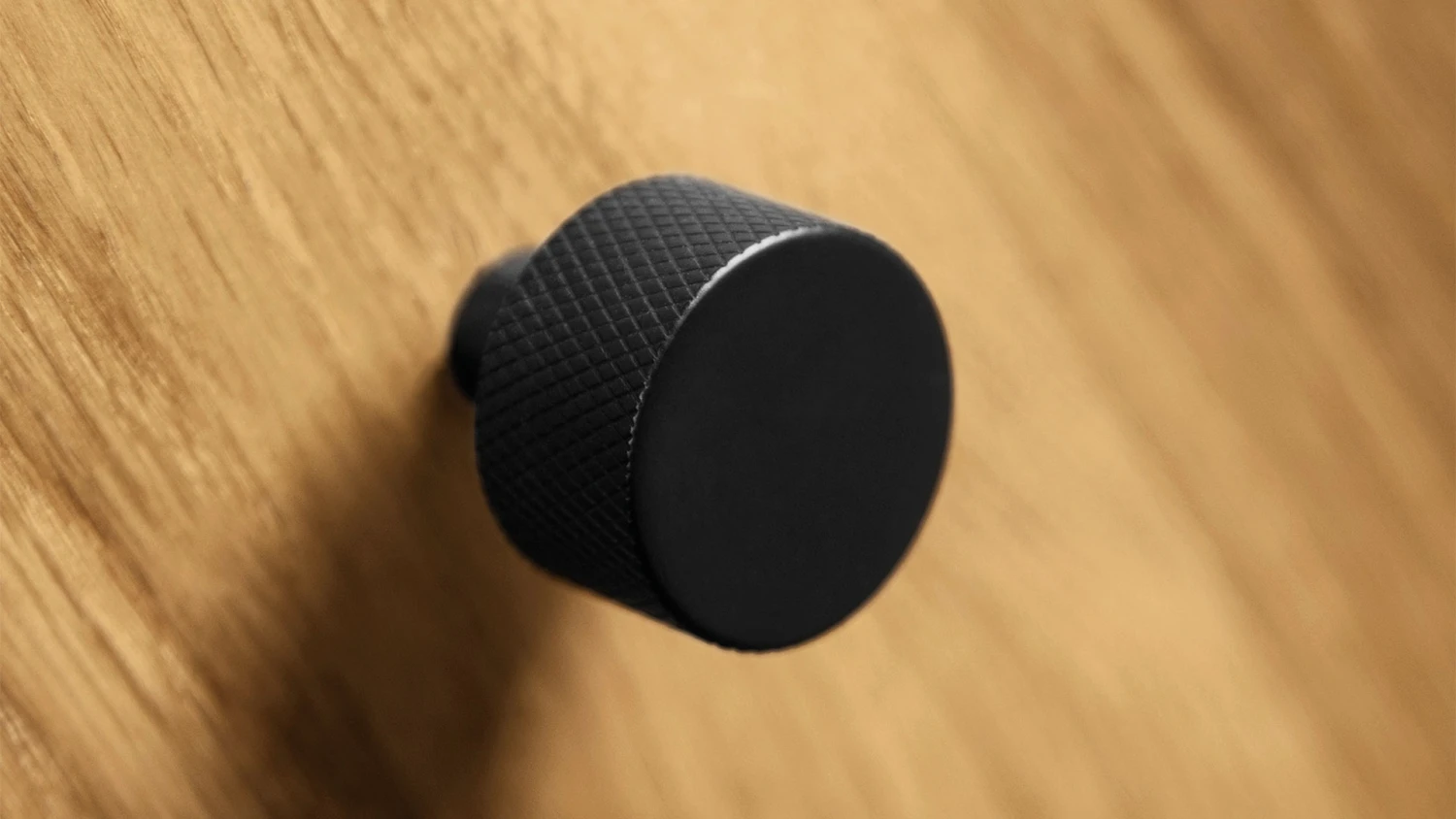 - Schiebe-Glastüren mit eingefrästen Griffmulden, Holztüren und Schubladen mit eleganten Knopfgriffen aus schwarzem Metall