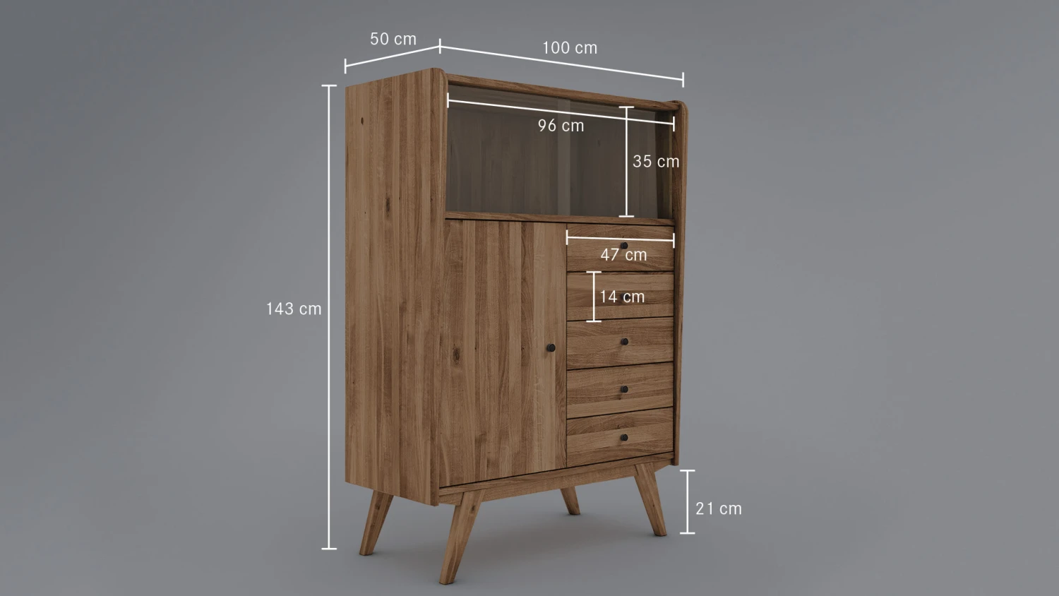 unten rechts 5 Schubladen, links 1 HolztĂĽre, dahinter 1 schmaler Holz-Fachboden