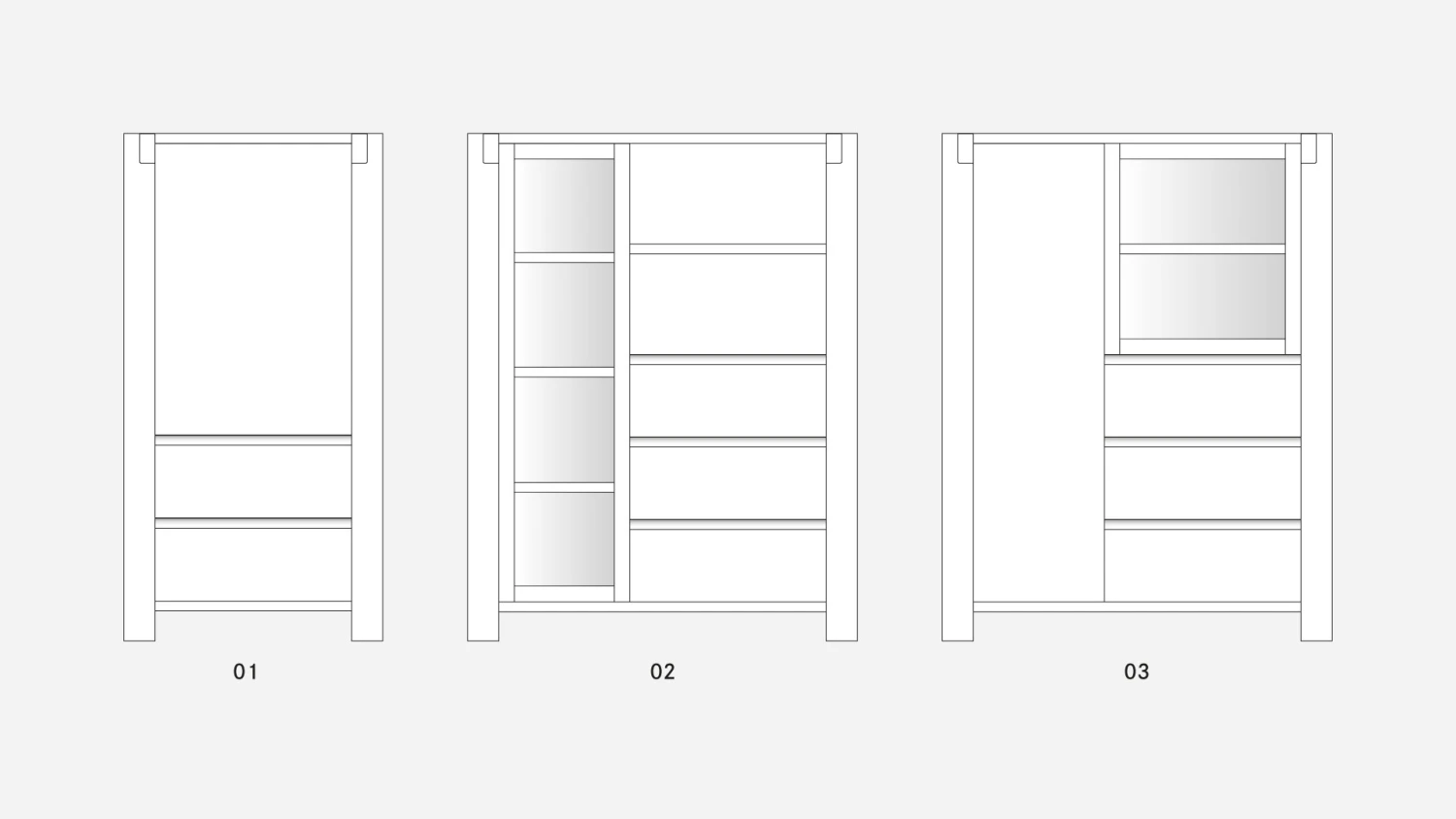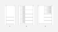 1 offenes Fach rechts, dahinter 1 Holzfachboden, darunter 3 Schubladen