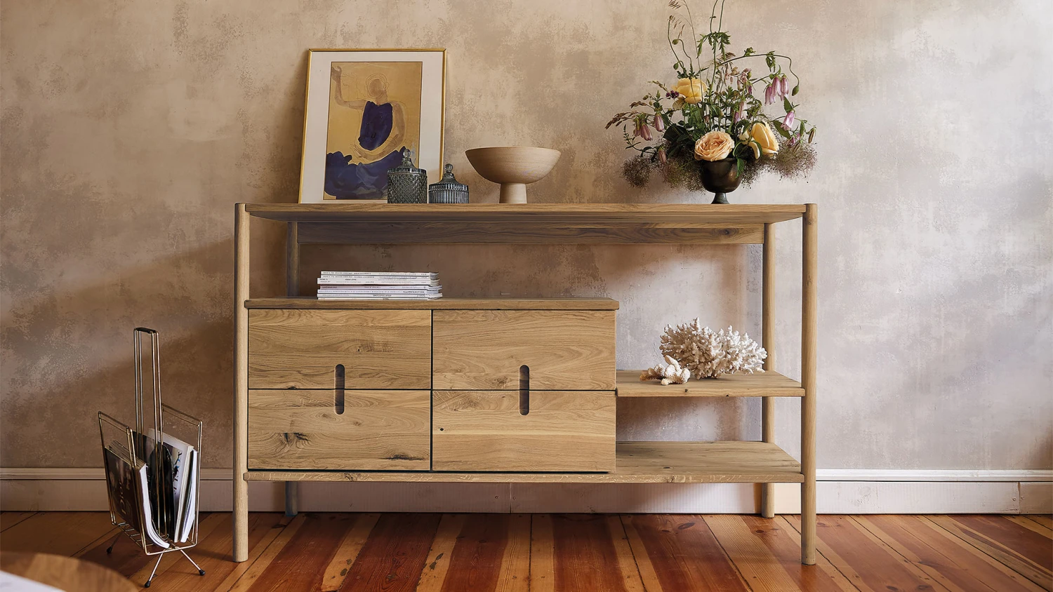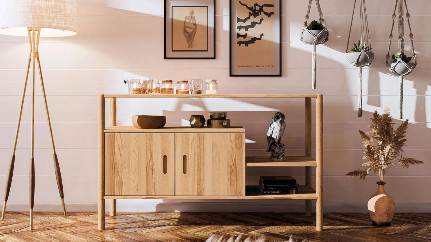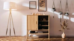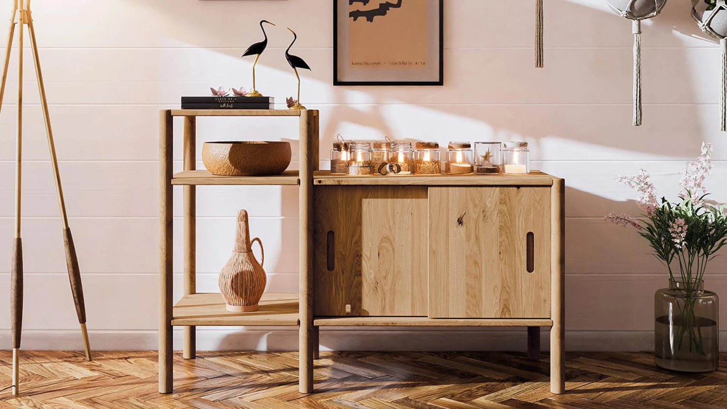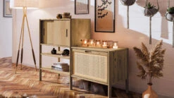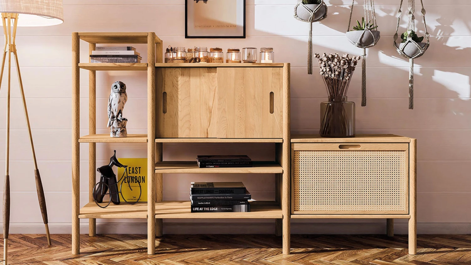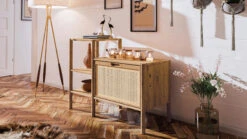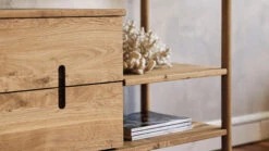 links oben 1 Schrankfach mit 2 Schiebetüren, darunter 2 offene Regalfächer, rechts 1 Klappfach mit Wiener Geflecht