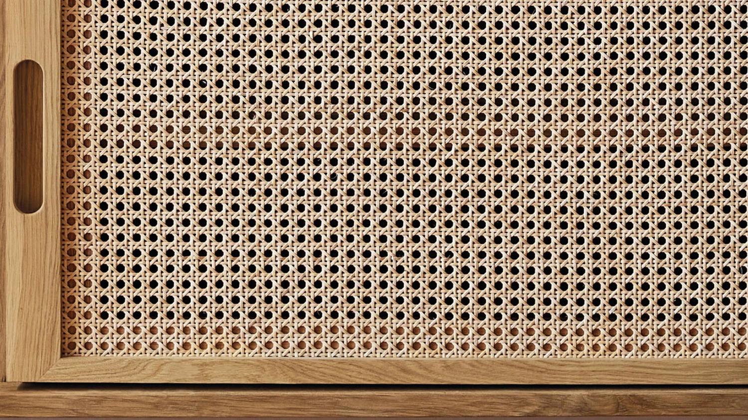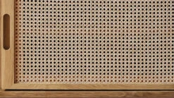 links 3 Regalfächer, rechts oben 1 Schrankfach mit 2 Schiebetüren mit Wiener Geflecht, darunter 2 offene Fächer