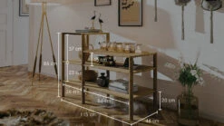 links 1 Schrankfach mit 2 Fachböden, rechts 3 Regalfächer, unten 1 breites Fach
