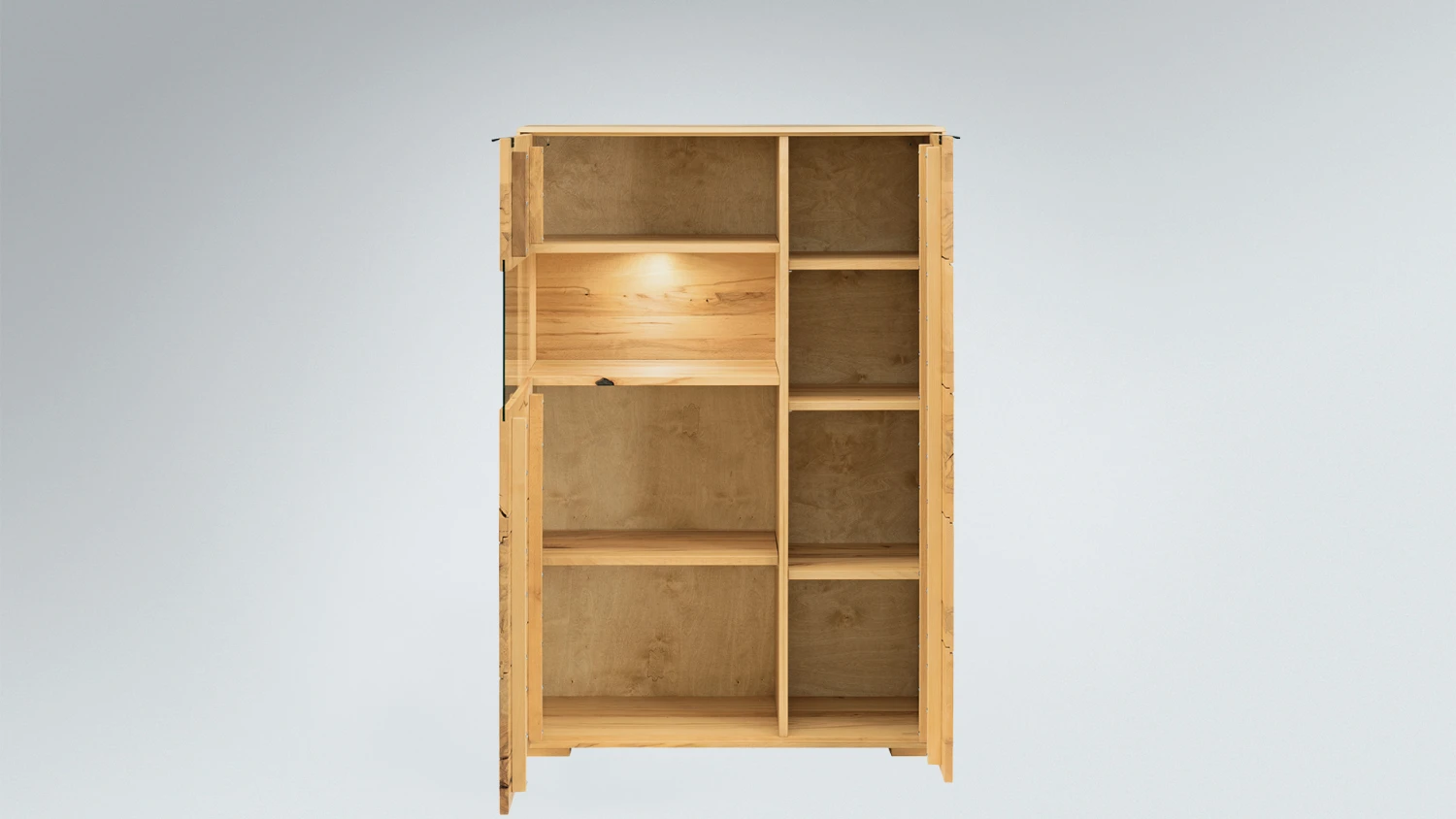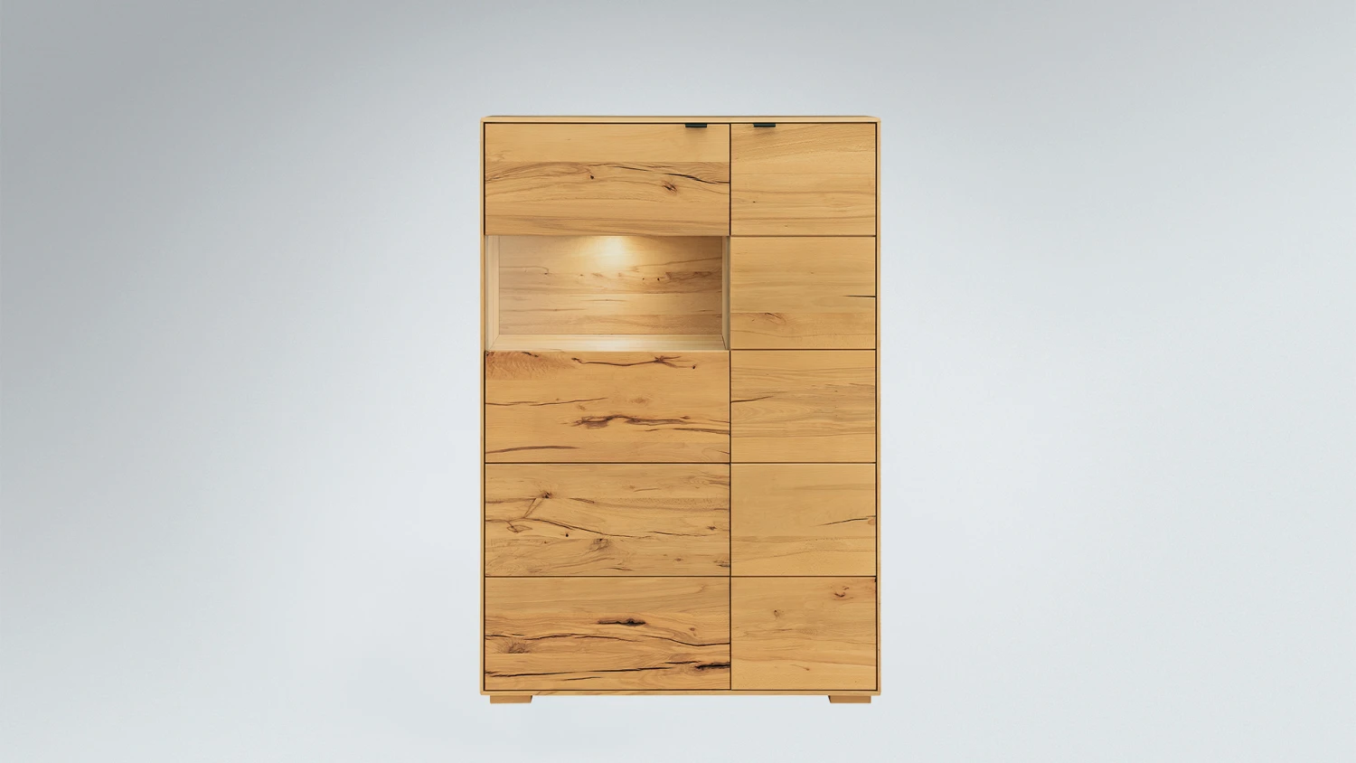 - Fronten aus massivem Wildkernbuchen- oder Wildeichenholz, aufwändig stabverleimt mit durchgehenden Lamellen
