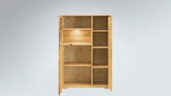 1 breite HolztĂĽre mit Glas-Einsatz links, dahinter 3 Holzfachböden – TĂĽre links angeschlagen