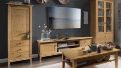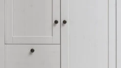 breites Highboard mit 1 HolztĂĽr – TĂĽranschlag beidseitig möglich, dahinter 5 Fachböden, daneben 1 HolztĂĽr oben – TĂĽranschlag beidseitig möglich, dahinter 3 Fachböden, darunter 2 Schubladen