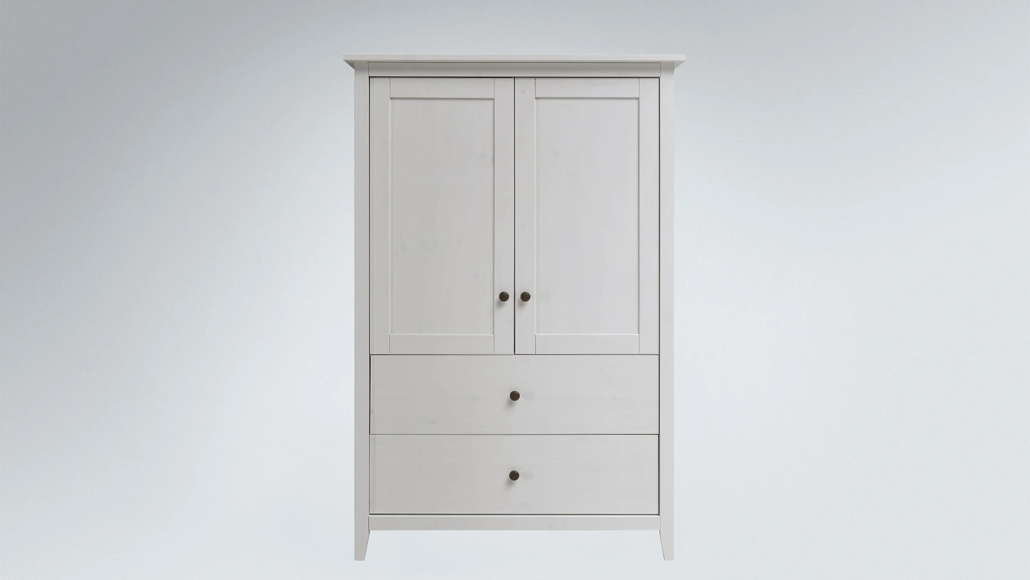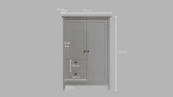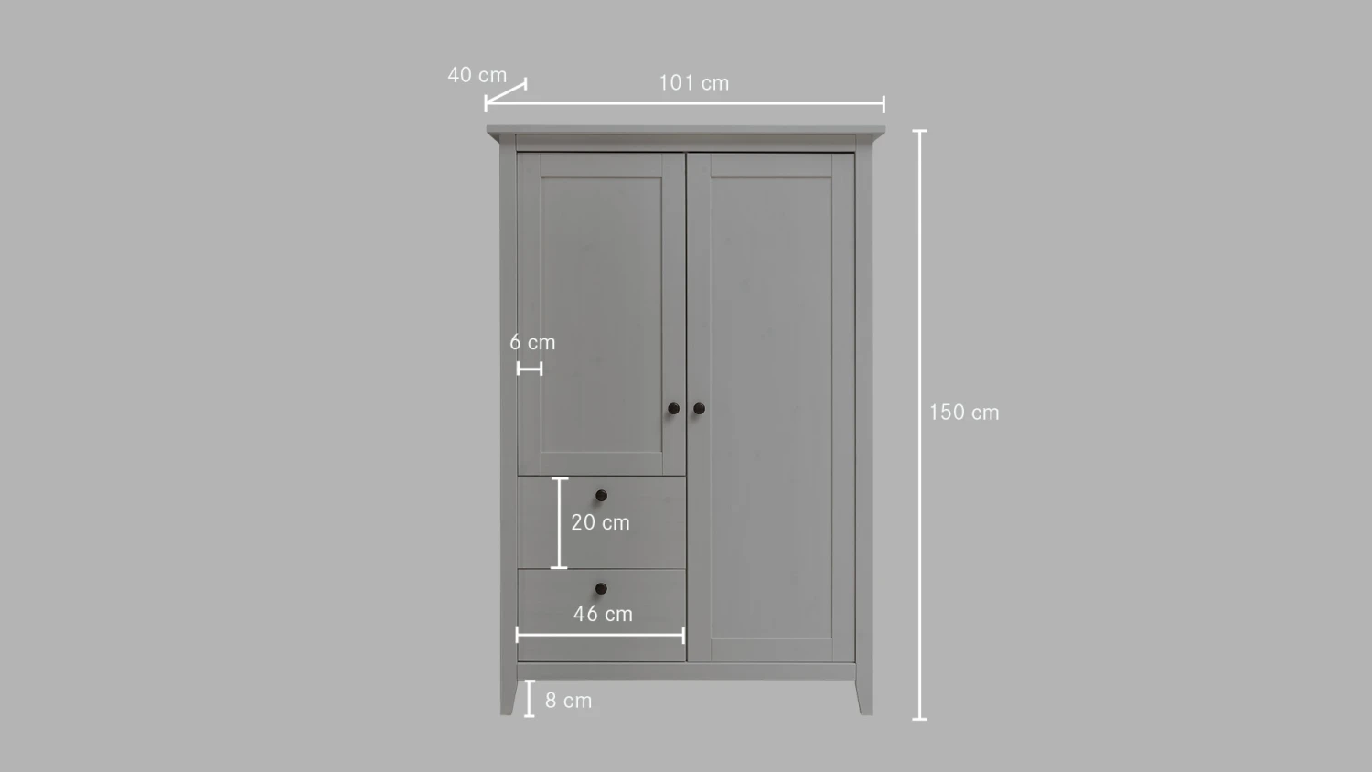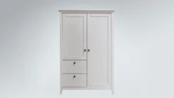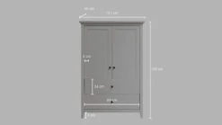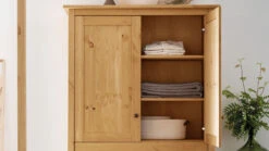 breites Highboard mit 2 Holztüren oben, dahinter 3 Fachböden, darunter 2 Schubladen