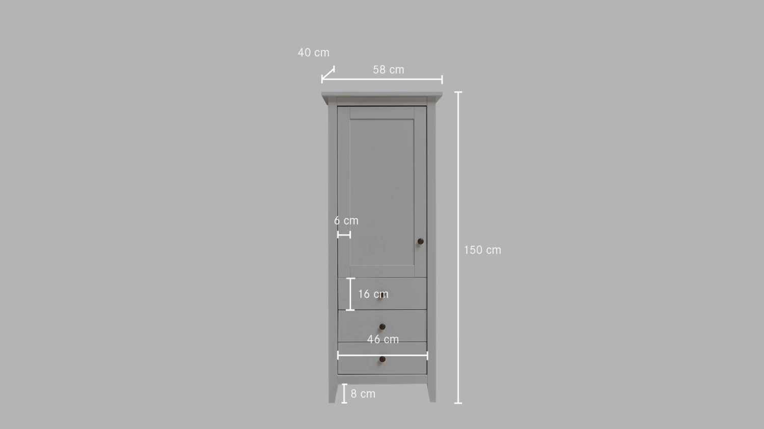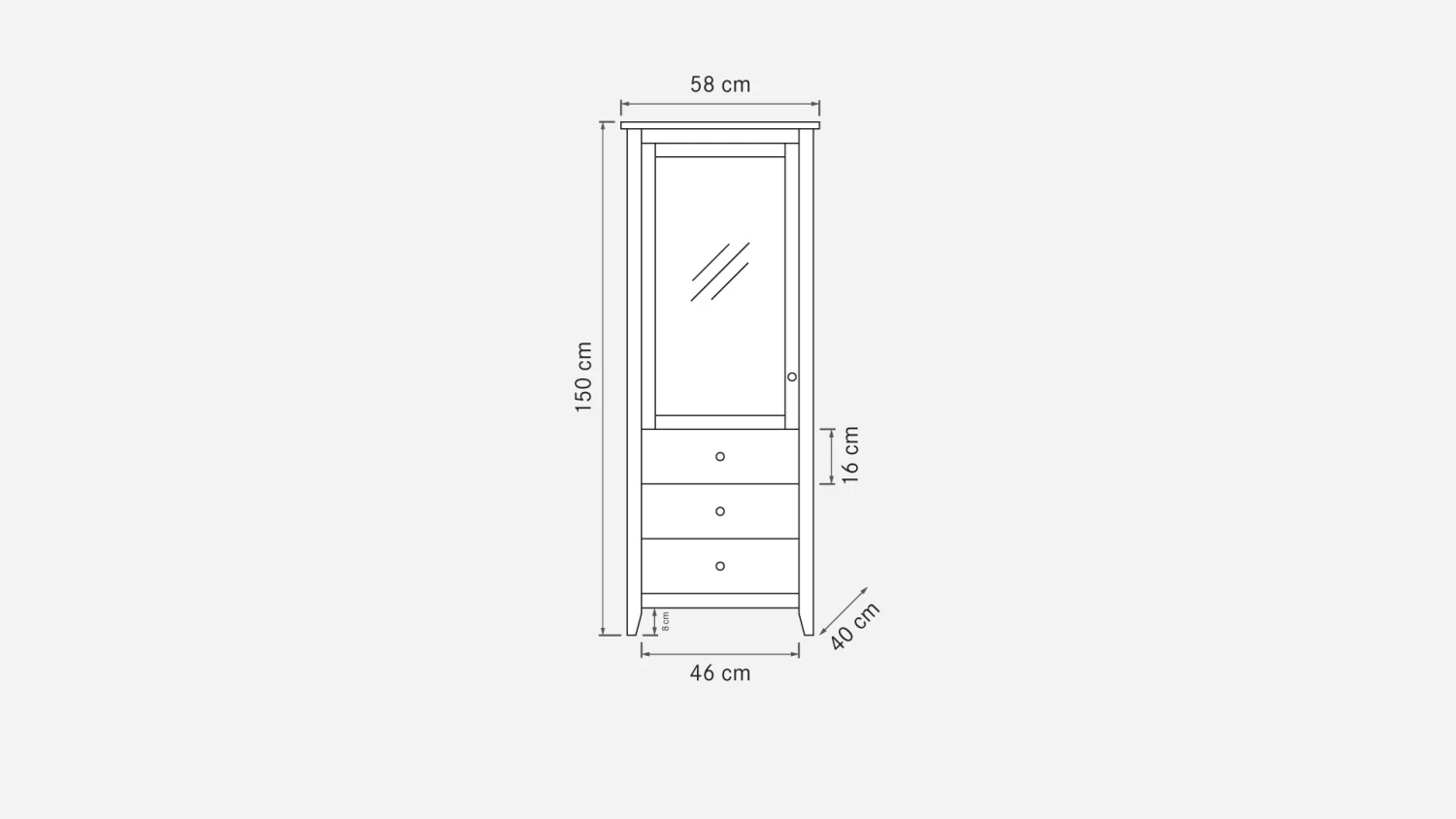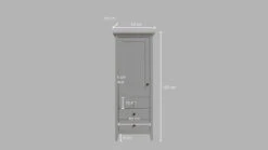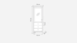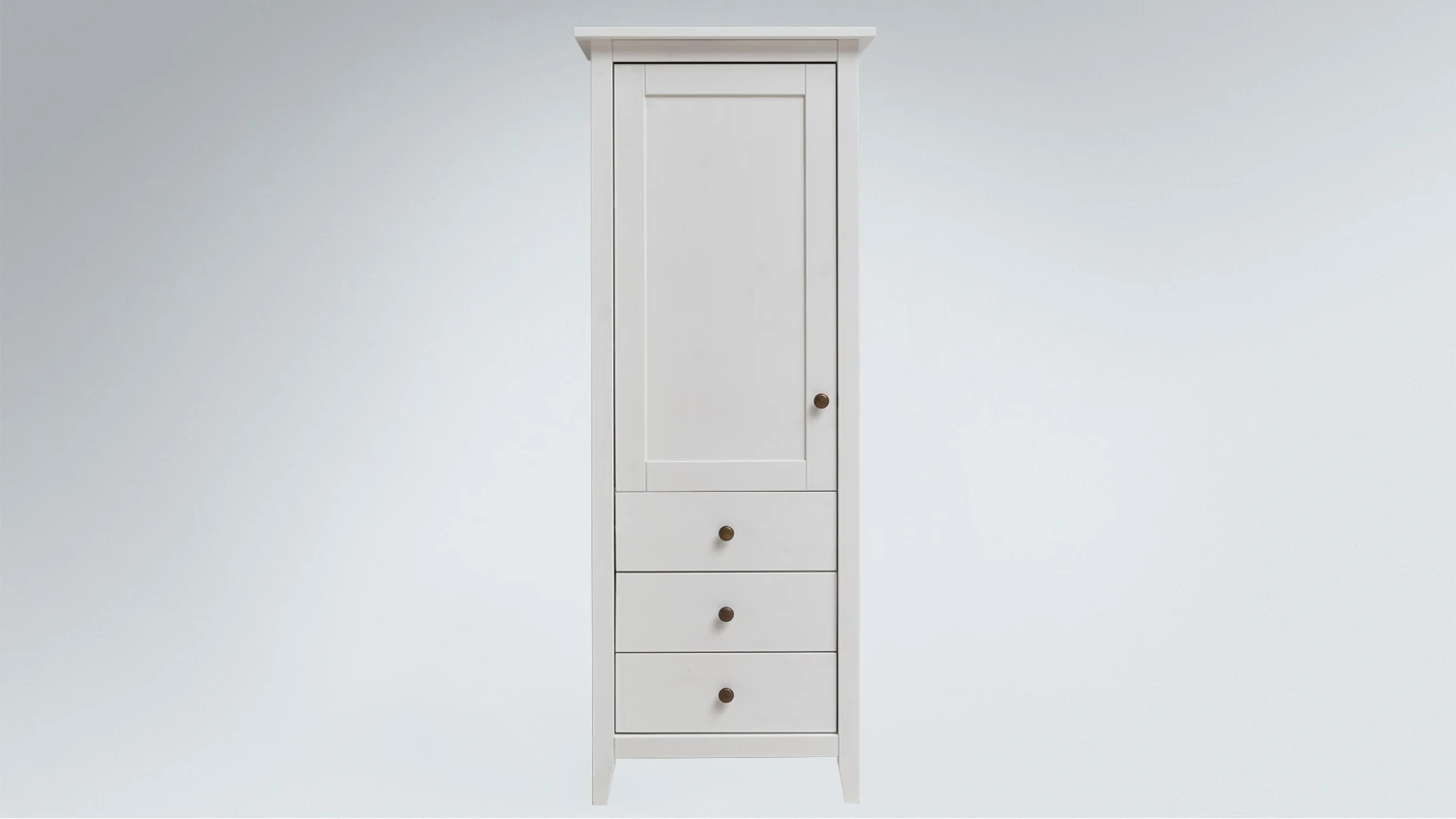 schmales Highboard mit 1 HolztĂĽr oben, dahinter 2 Fachböden – TĂĽranschlag beidseitig möglich, darunter 3 Schubladen