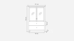 breites Highboard mit 2 Holztüren mit Glaseinsatz oben, dahinter 3 Fachböden, darunter 2 Schubladen