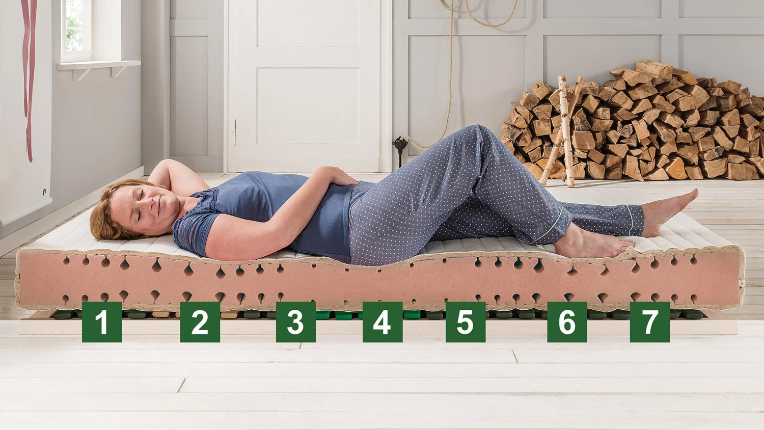 - flächenelastische Matratze mit 7-Zonen-Körperstützsystem zur sinnvollen Abfederung des Schulterbereichs und elastischen Stützung des Beckens