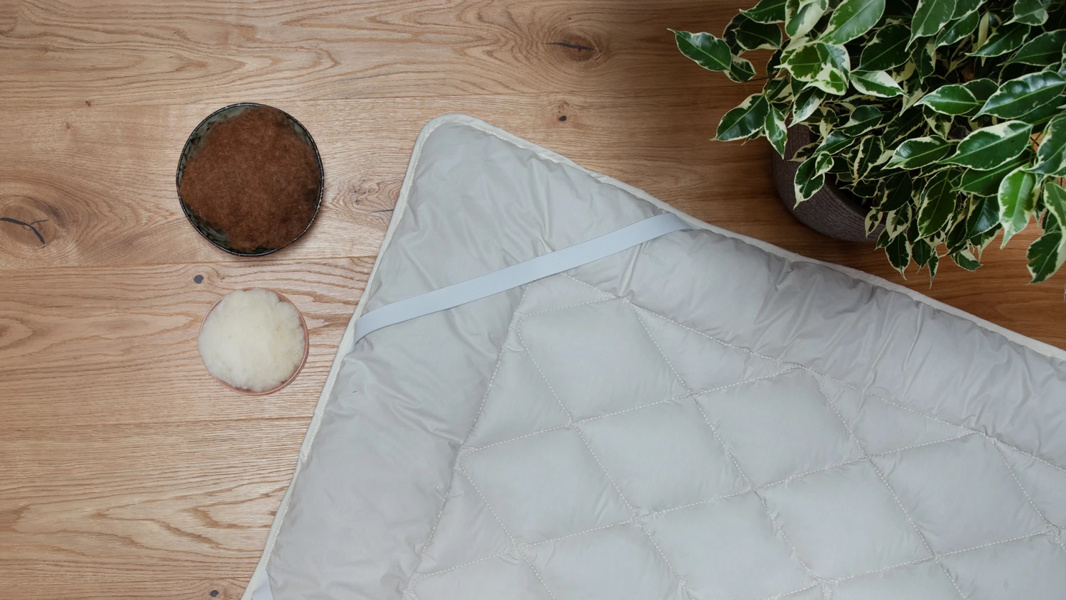 - strapazierfähig durch Beimischung von Schafschurwolle (kbT) – Stabilisation des zarten Kamelflaumhaar-Vlieses ohne Beeinträchtigung der hervorragenden Klimaeigenschaften