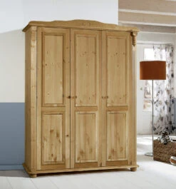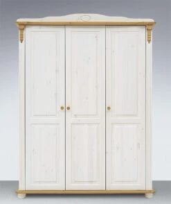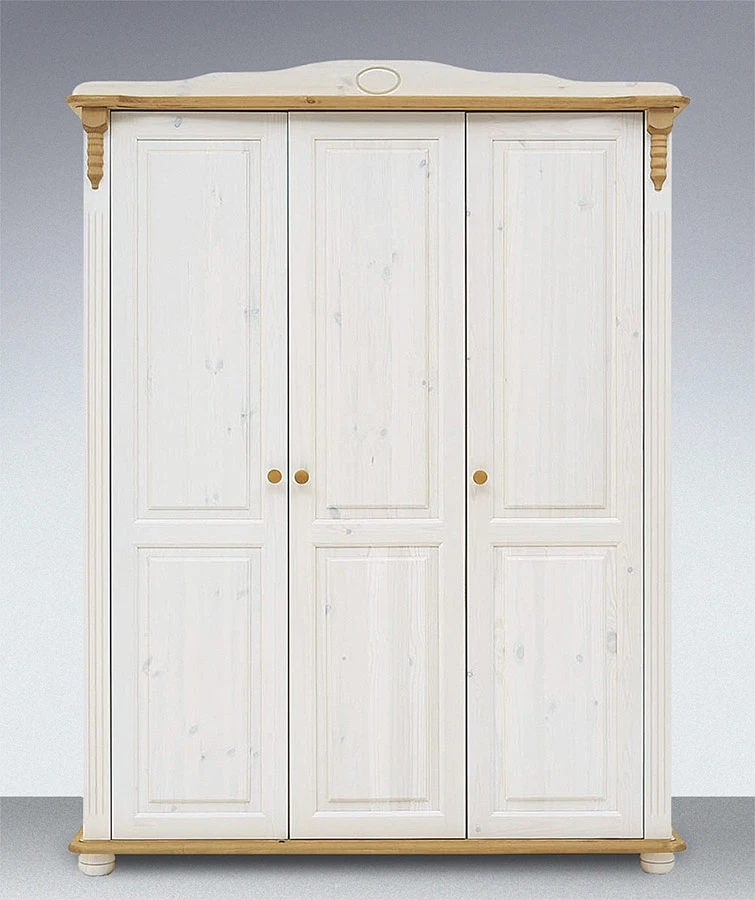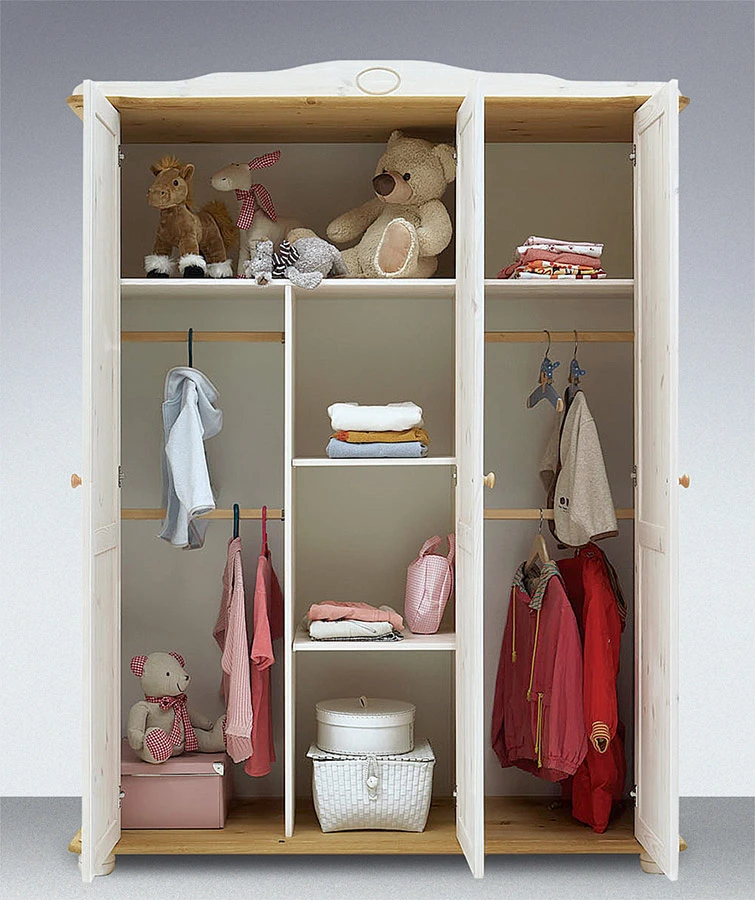 links davon 2 kurze Kleiderstangen, rechts davon 2 kurze Einlegeböden - 3-türiger Schrank