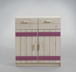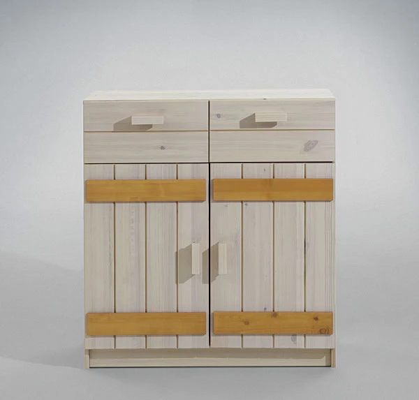 mit 2 schmalen, nebeneinander angeordneten Schubladen oben und 2 Türen unterhalb, dahinter 1 Fachboden