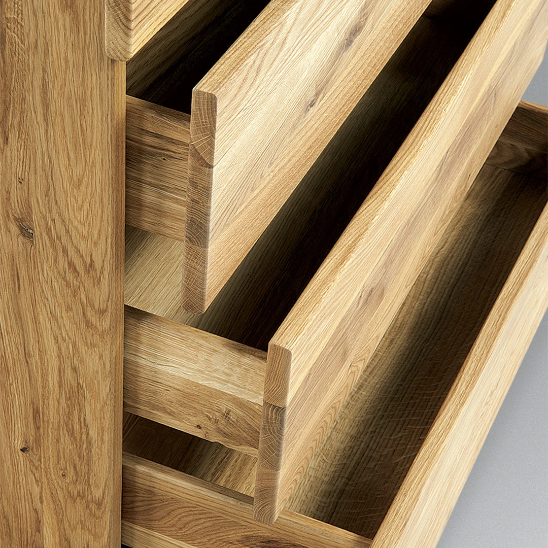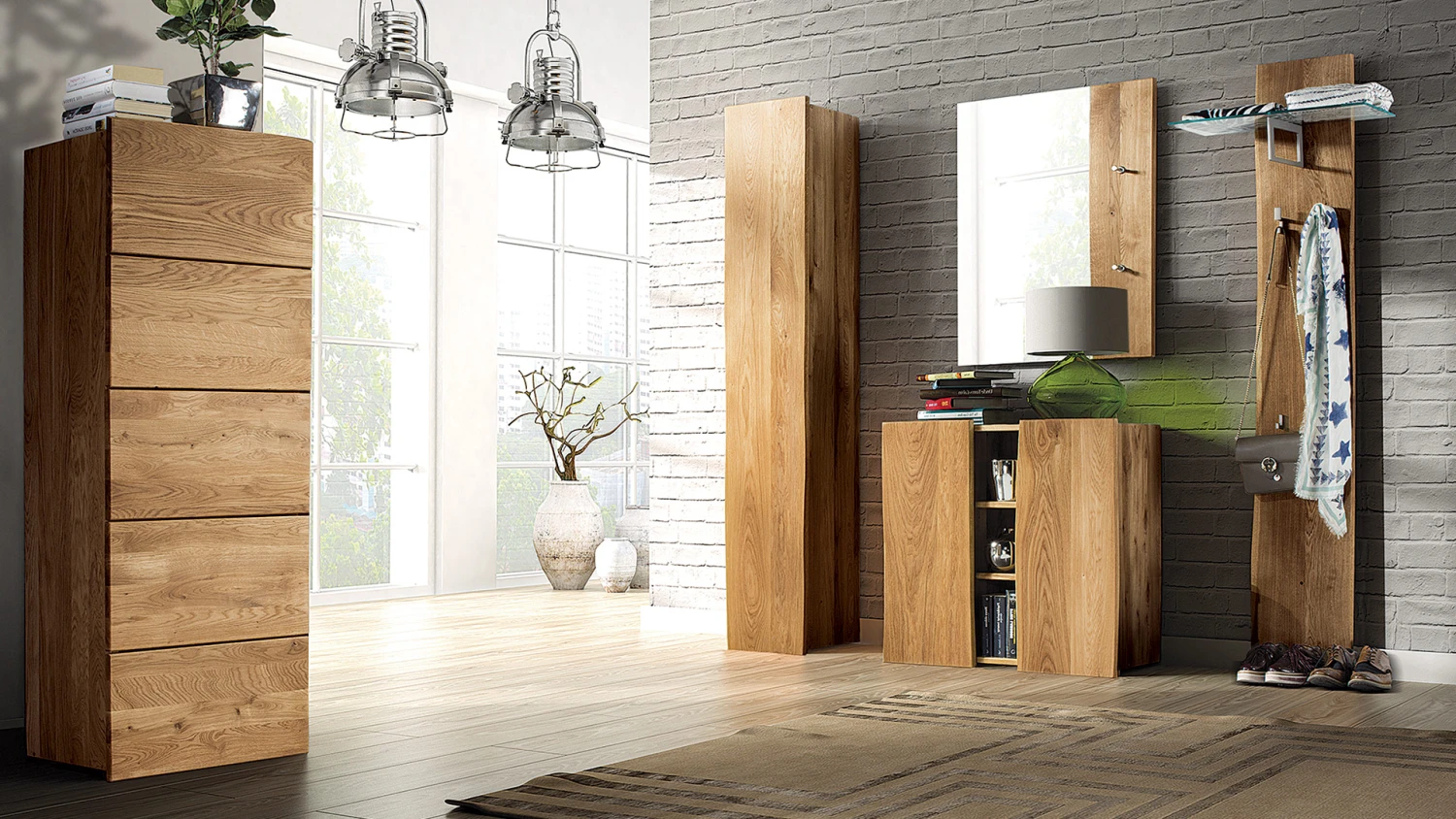 - Astlöcher und die der Natur nachempfundene Baumkante prägen den Charakter dieser faszinierenden Möbelserie