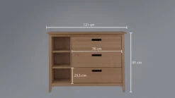 3 schmale offene Fächer, daneben 3 breite Schubladen
