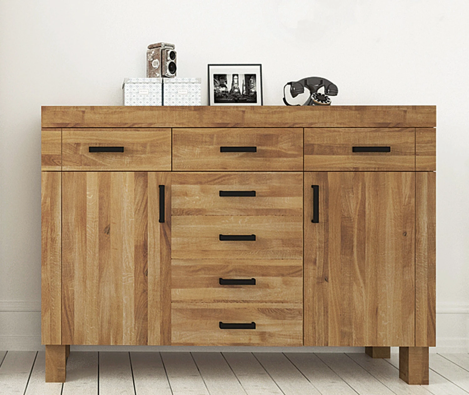 links und rechts jeweils 1 TĂĽre, dahinter jeweils 1 kurzer Fachboden, ĂĽber den TĂĽren jeweils 1 Schublade, in der Mitte 5 Schubladen