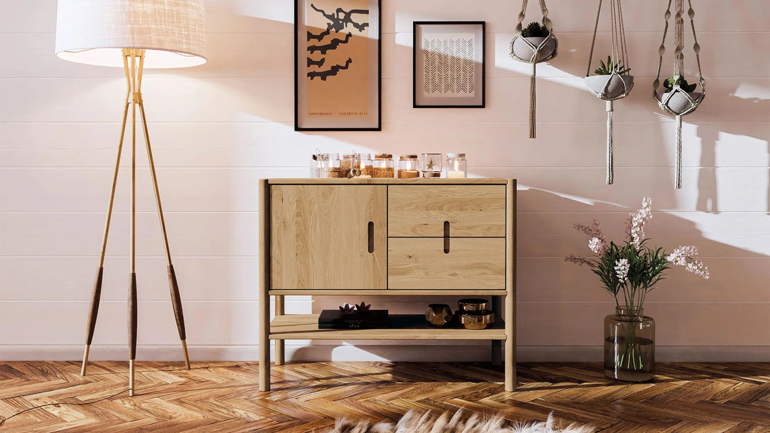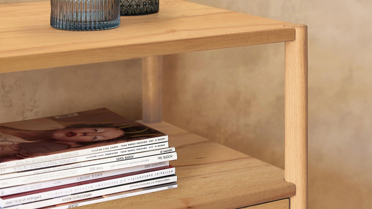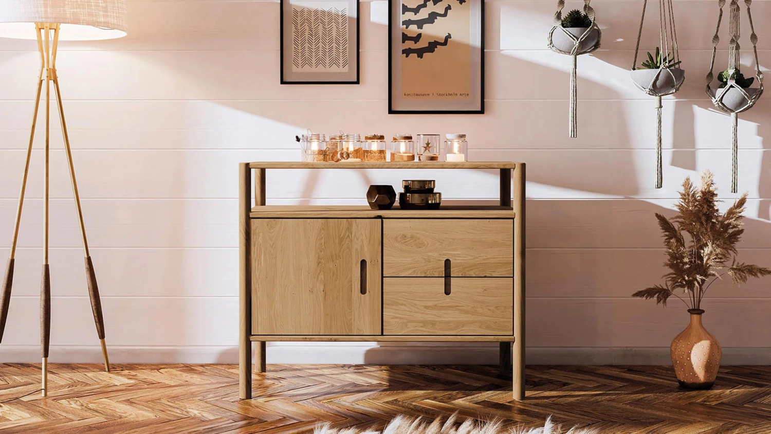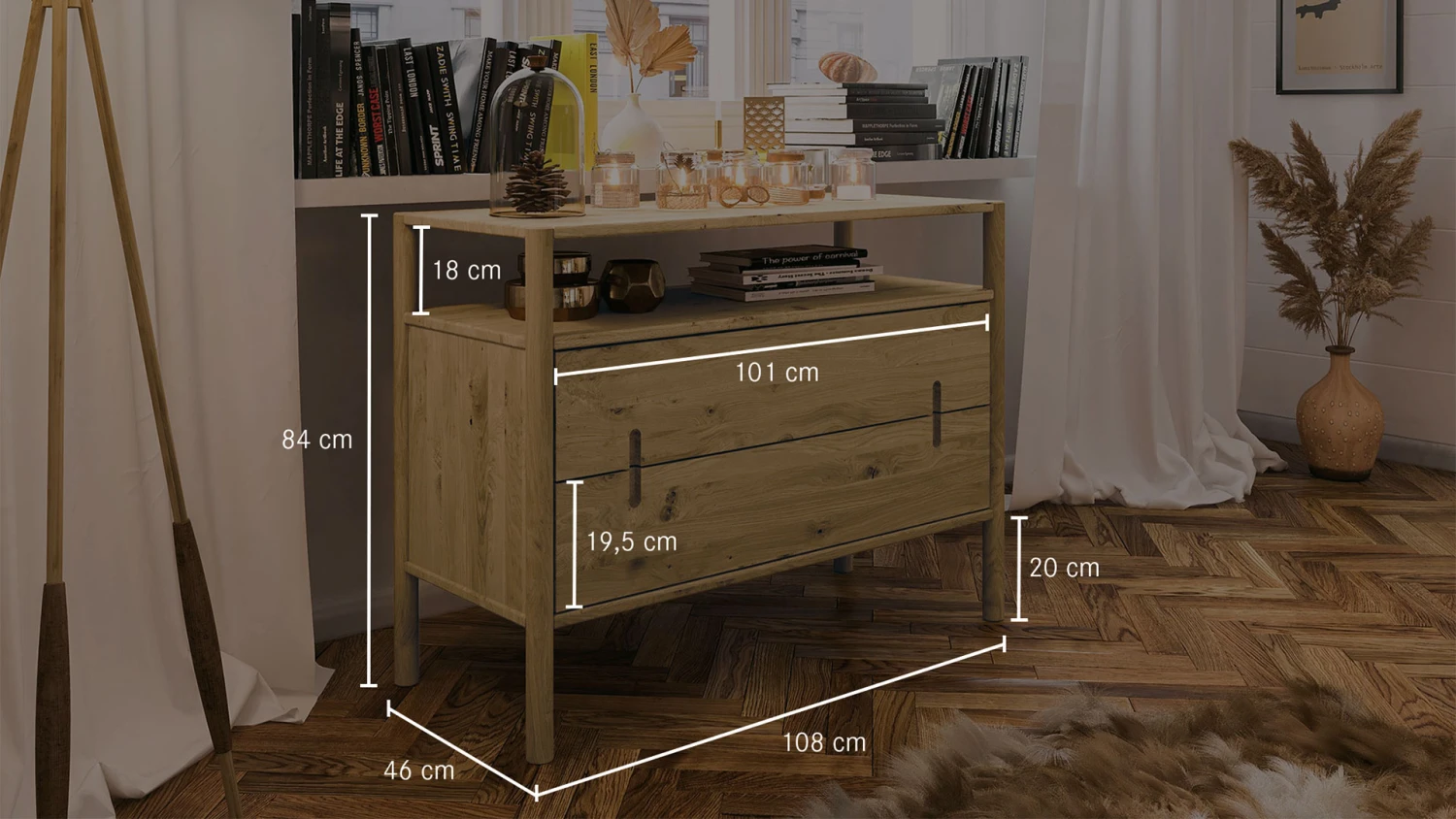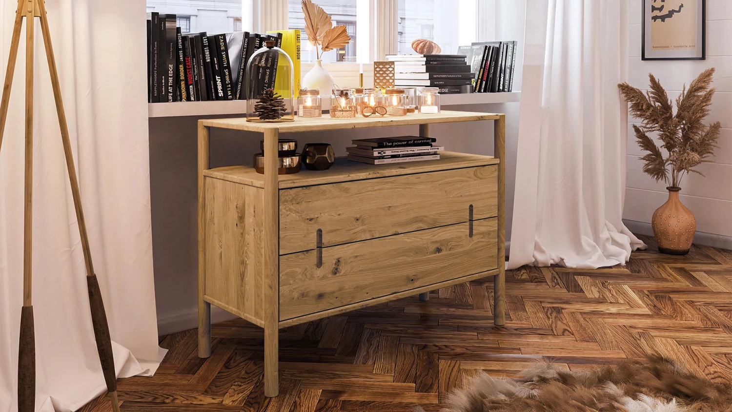 2 breite Schubladen, darĂĽber 1 offenes Fach