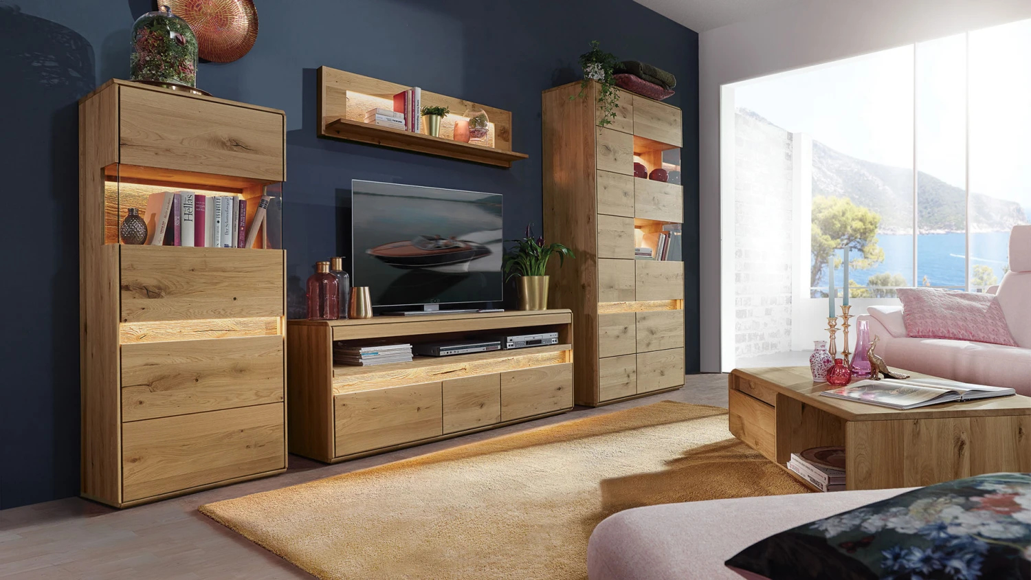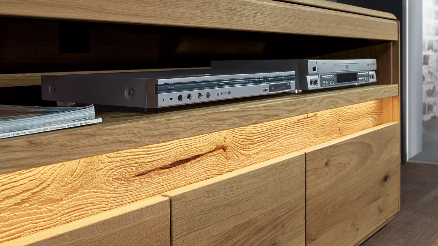 - sichtbare Rückwände und Applikationen aus gebürstetem Eichenholz
