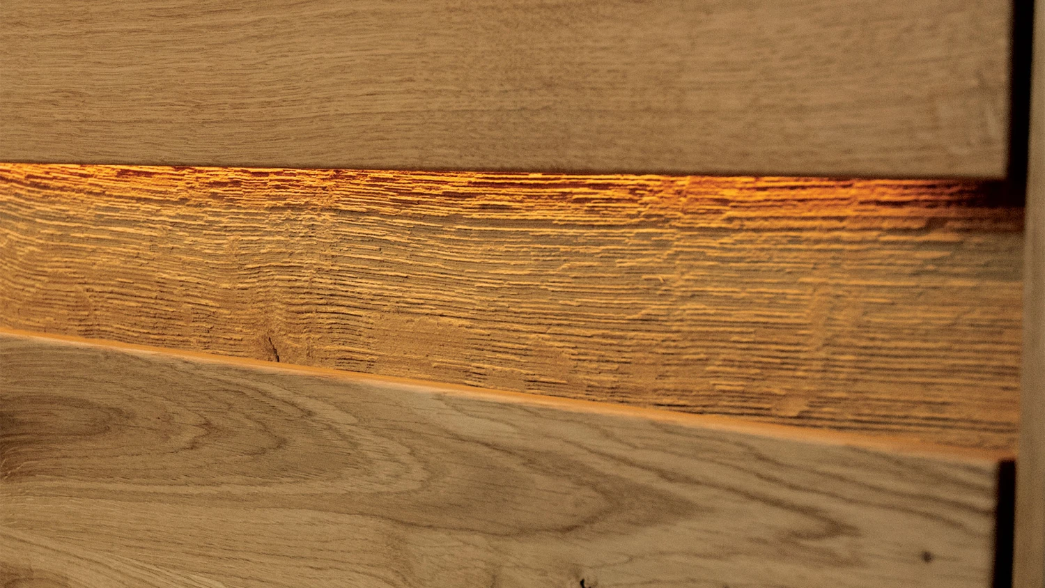 - das gebĂĽrstete Eichenholz an den Applikationen ist ein ganz besonderer Blickfang