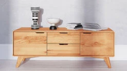 links und rechts jeweils 1 TĂĽre, in der Mitte 2 Schubladen