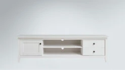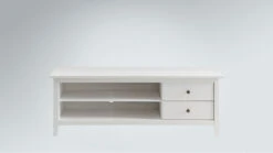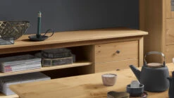 breites Lowboard mit 2 offenen Fächern; links daneben 1 Holztür, rechts daneben 2 Schubladen
