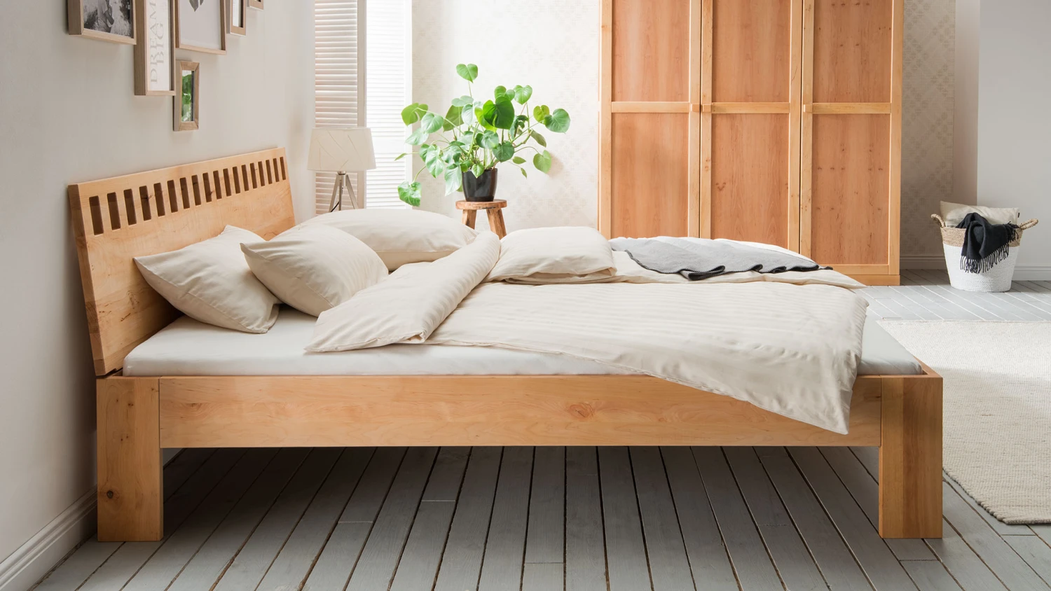 groĂźflächiges, rechteckiges Kopfteil, das die Eigenarten der einzelnen Hölzer bestens zur Geltung bringt - Kopfteil „zweigeteilt“